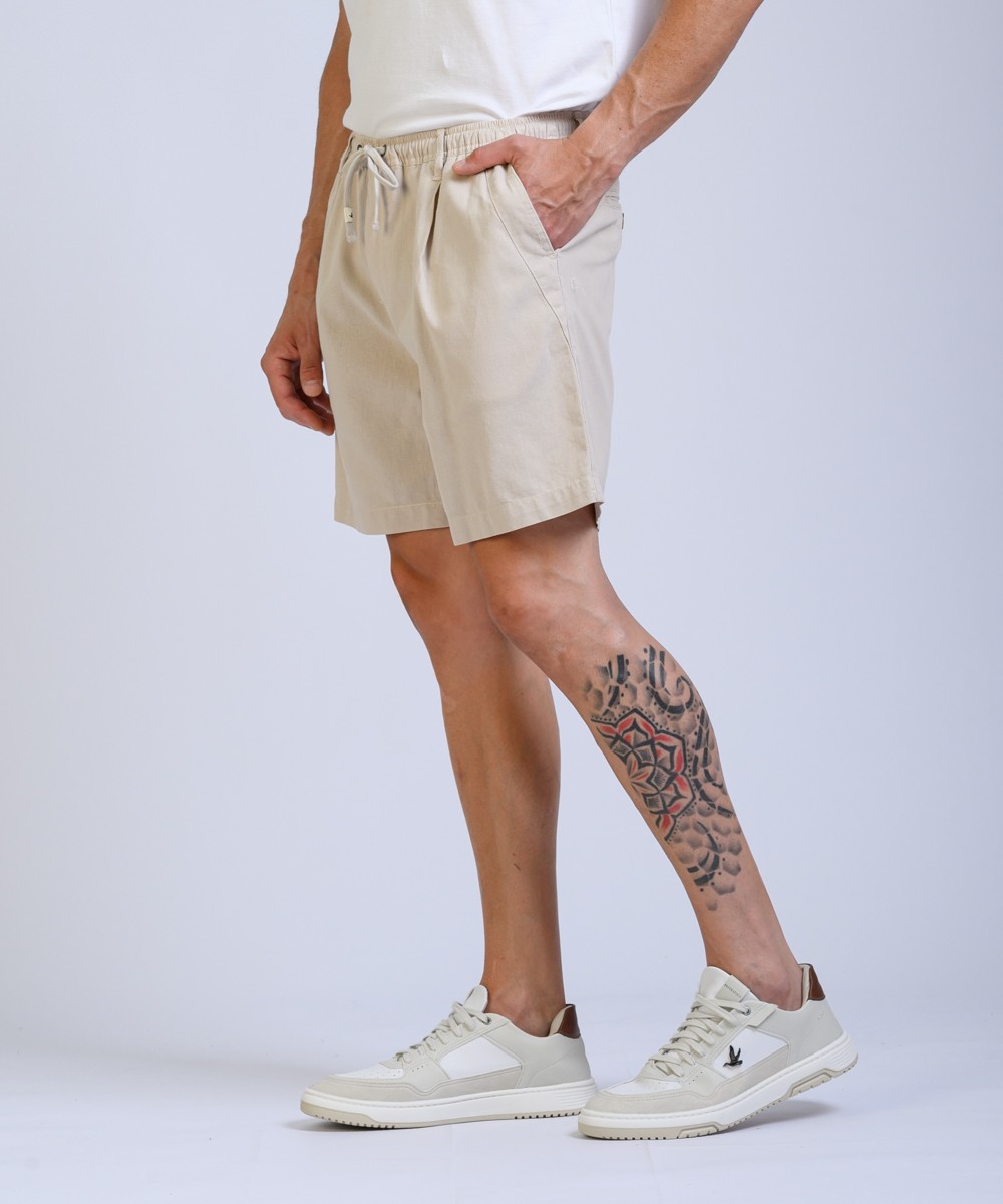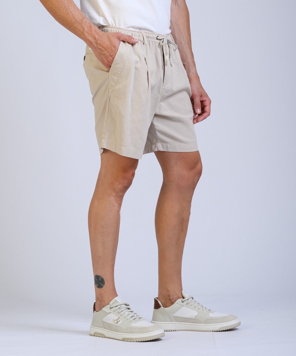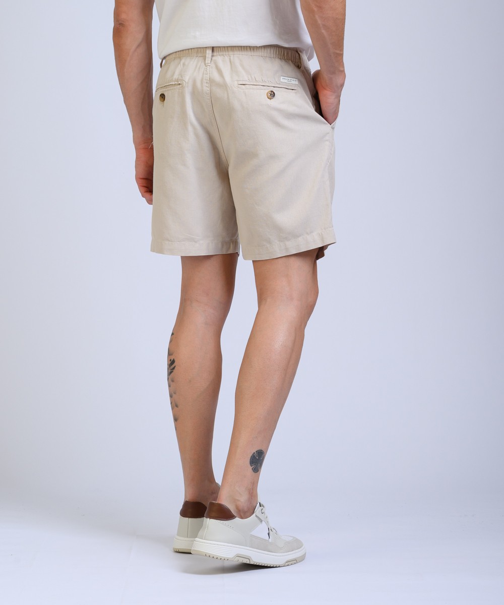 Bermuda regular fit confeccionada en lino de textura natural, combina frescura y distinción en una silueta relajada. La cintura elástica con cordón regulable se complementa con presillas para cinturón, mientras que las pinzas frontales aportan estructura y amplitud en la zona de cadera, favoreciendo el calce. Moldería de tiro intermedio, con bolsillos delanteros amplios y dos bolsillos traseros con cierre por botón. Producto importado, con terminaciones precisas y calidad superior.