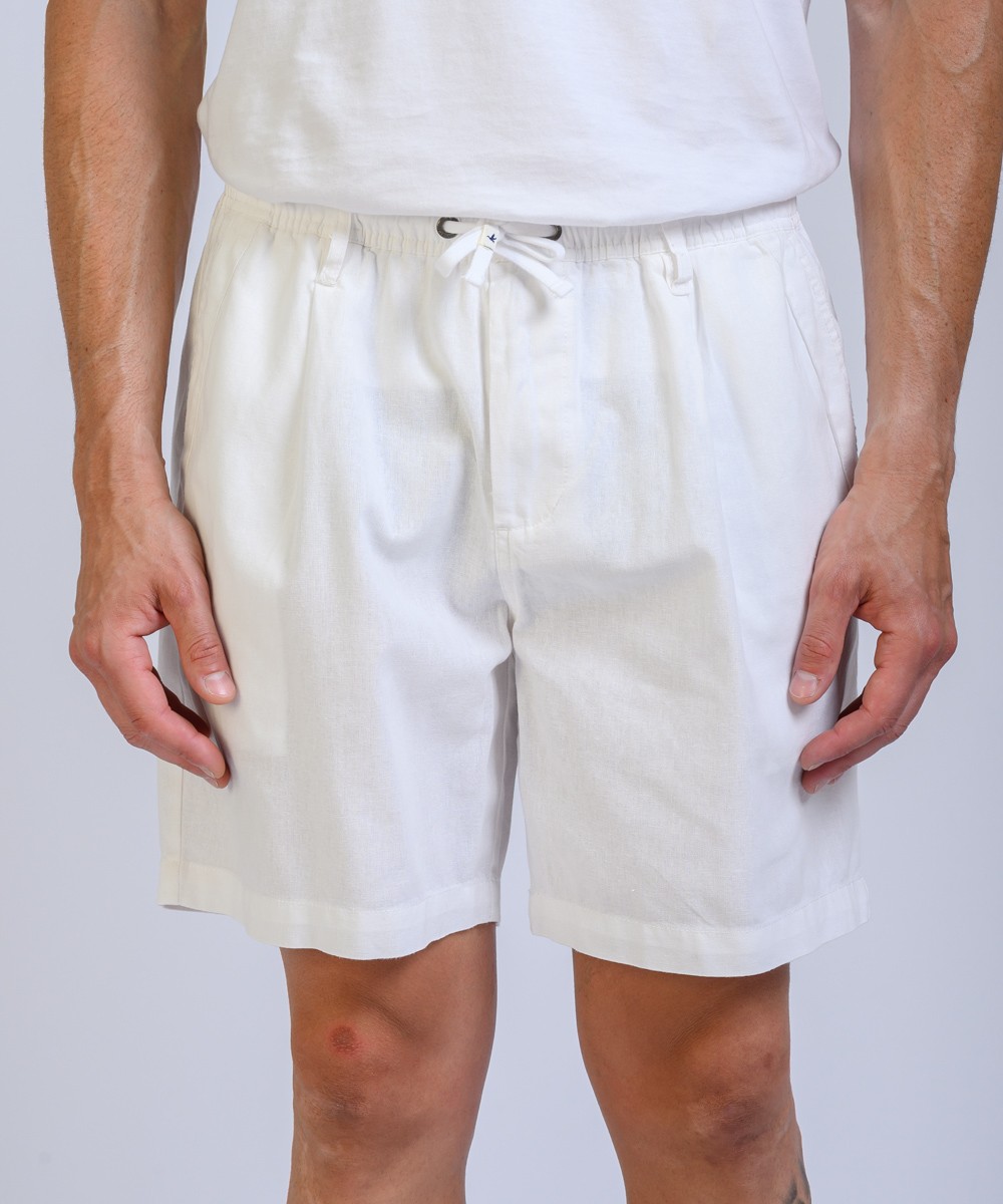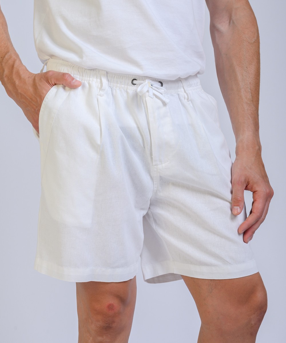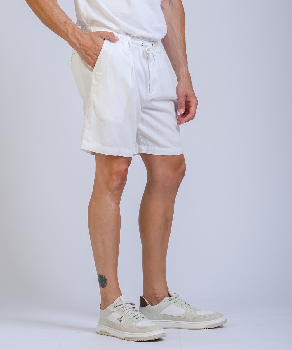 Bermuda regular fit confeccionada en lino de textura natural, combina frescura y distinción en una silueta relajada. La cintura elástica con cordón regulable se complementa con presillas para cinturón, mientras que las pinzas frontales aportan estructura y amplitud en la zona de cadera, favoreciendo el calce. Moldería de tiro intermedio, con bolsillos delanteros amplios y dos bolsillos traseros con cierre por botón. Producto importado, con terminaciones precisas y calidad superior.