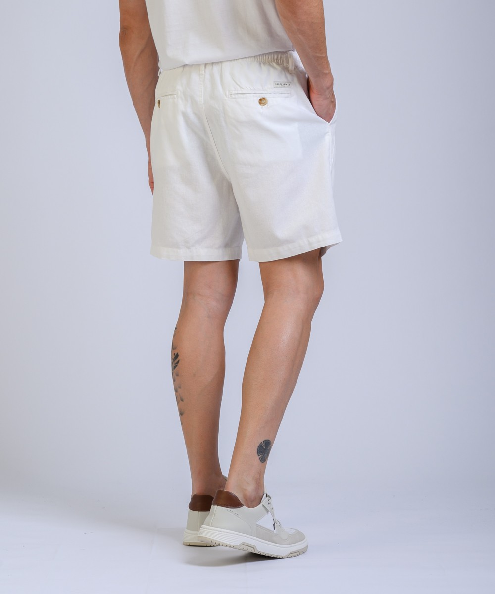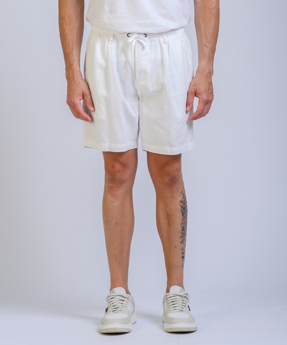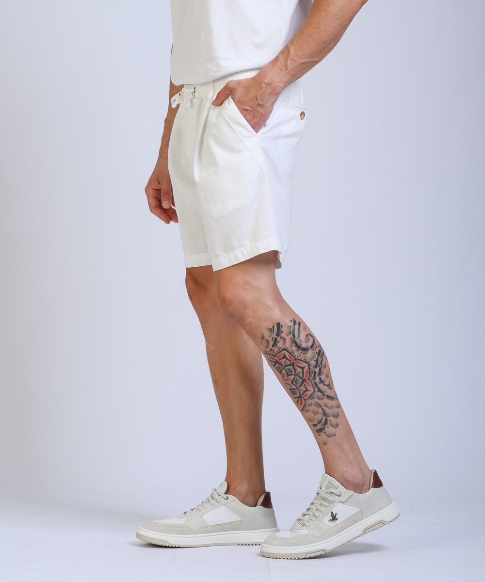Bermuda regular fit confeccionada en lino de textura natural, combina frescura y distinción en una silueta relajada. La cintura elástica con cordón regulable se complementa con presillas para cinturón, mientras que las pinzas frontales aportan estructura y amplitud en la zona de cadera, favoreciendo el calce. Moldería de tiro intermedio, con bolsillos delanteros amplios y dos bolsillos traseros con cierre por botón. Producto importado, con terminaciones precisas y calidad superior.
