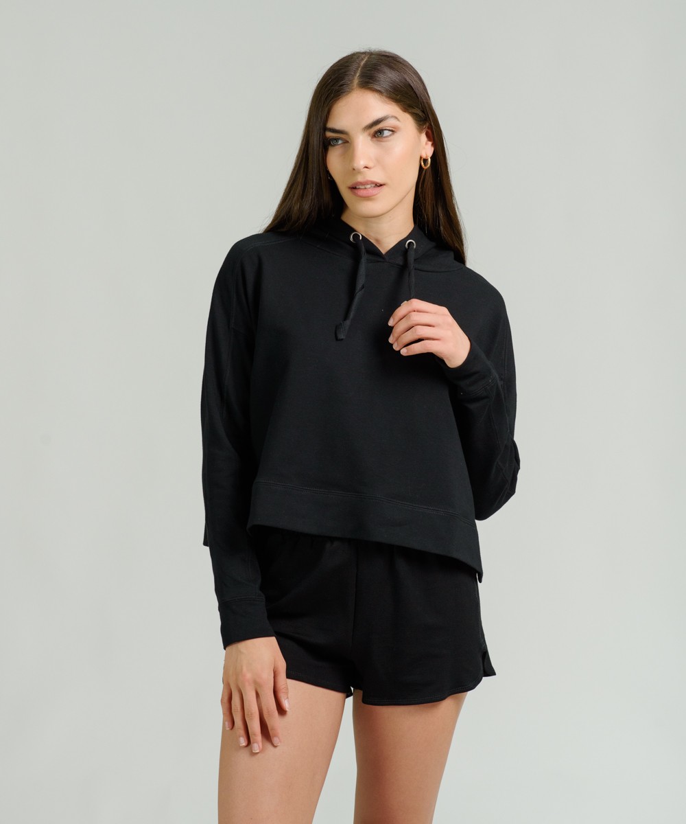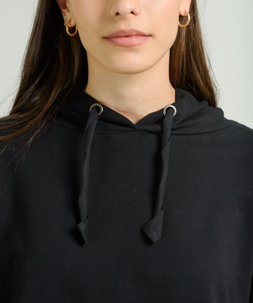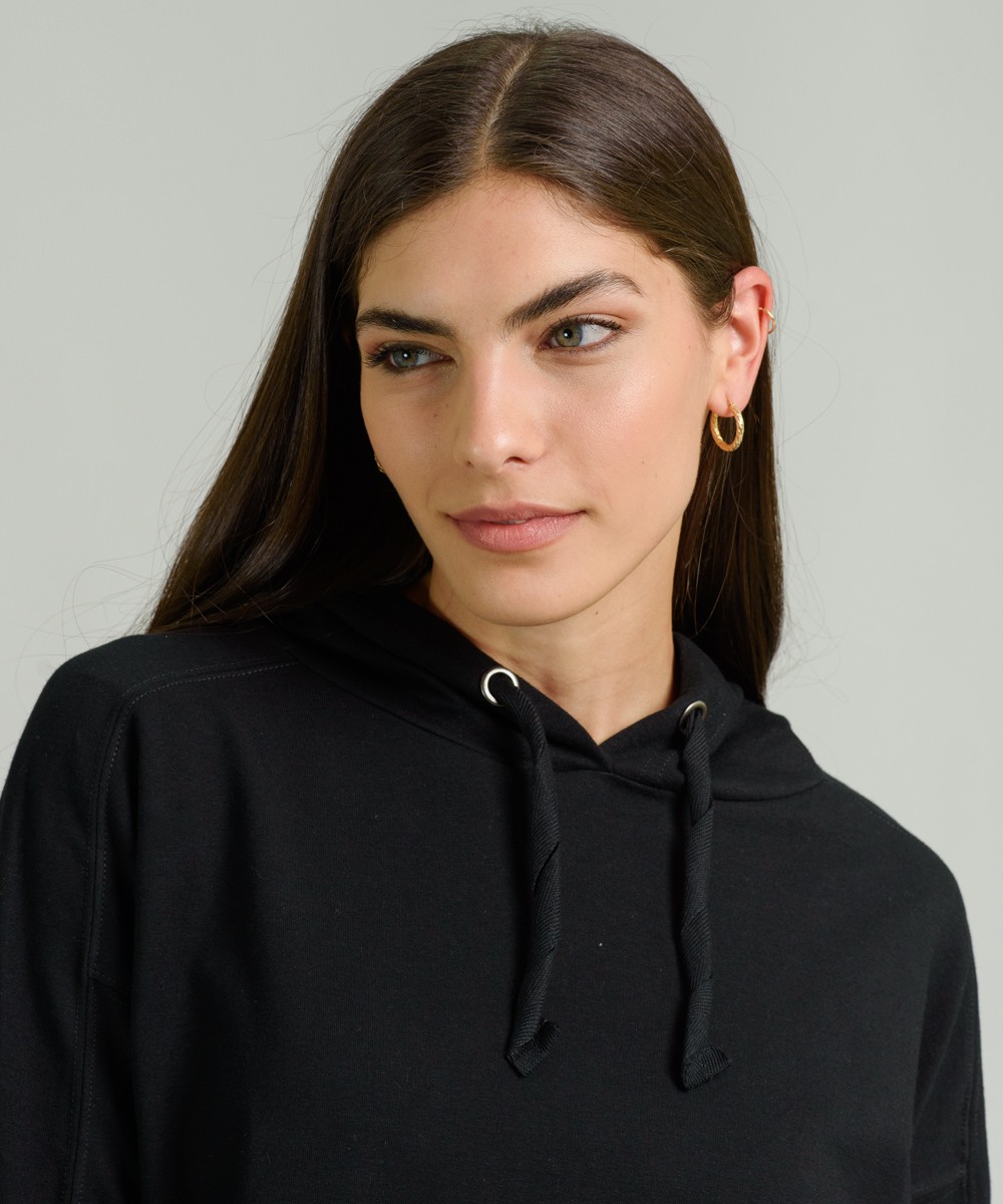 Buzo oversize con capucha y aberturas en los laterales de tejido rústico de tacto muy suave. Corte amplio con hombros caídos. Largo de cuerpo a la primera cadera. Bordado en el lateral.