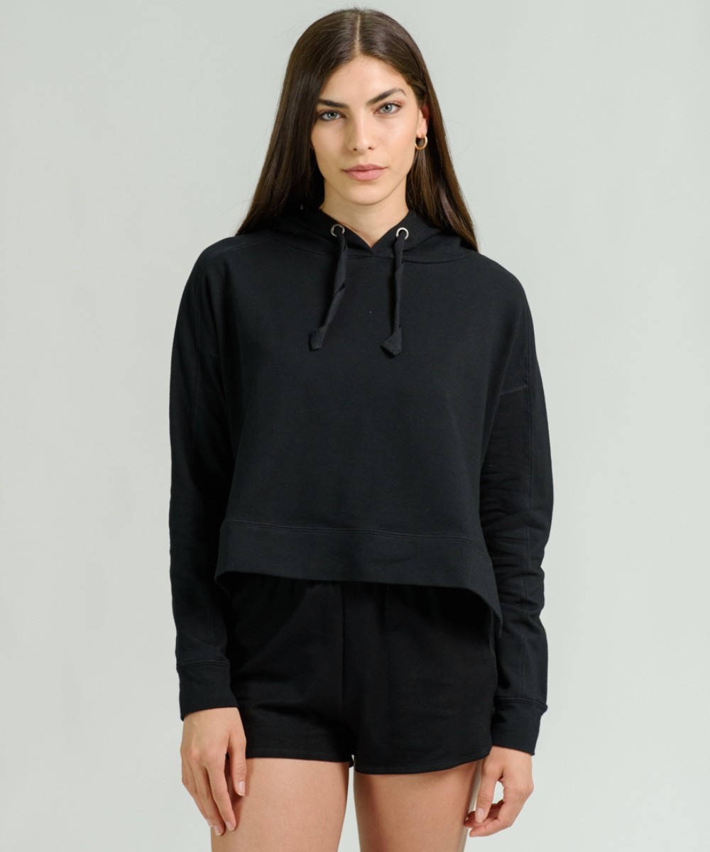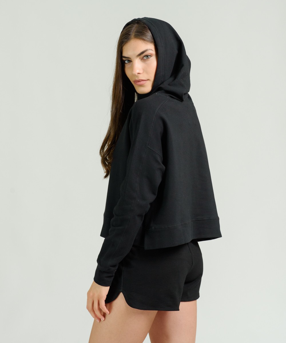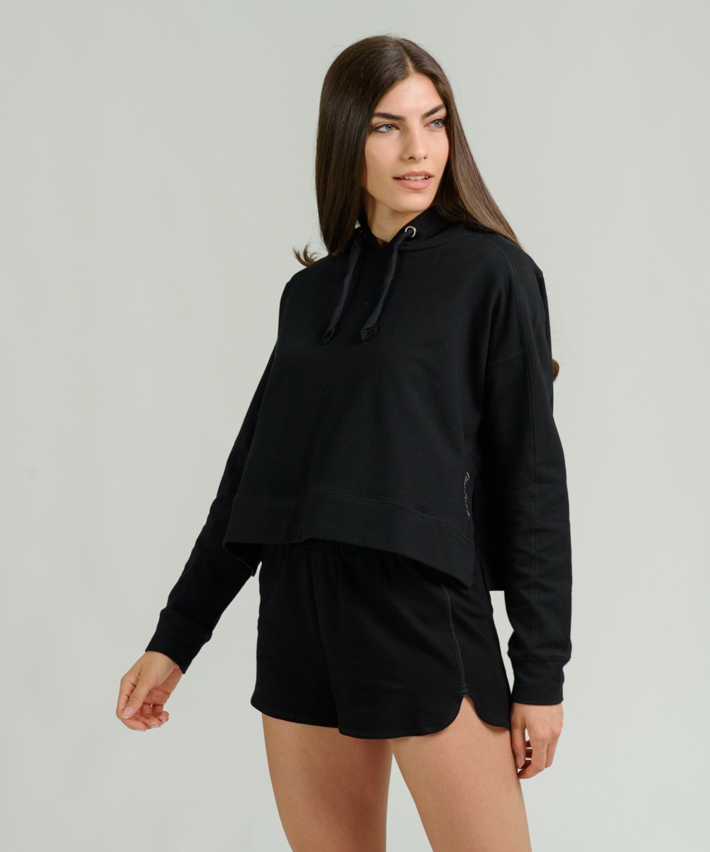 Buzo oversize con capucha y aberturas en los laterales de tejido rústico de tacto muy suave. Corte amplio con hombros caídos. Largo de cuerpo a la primera cadera. Bordado en el lateral.