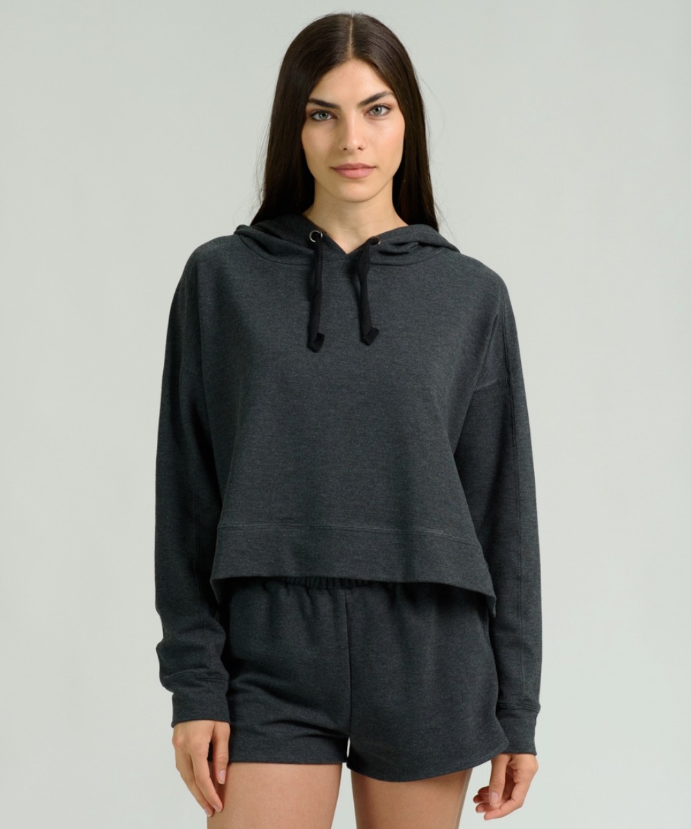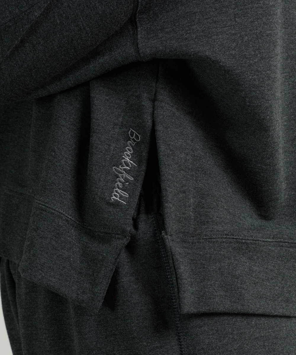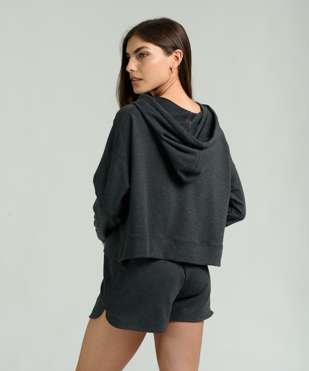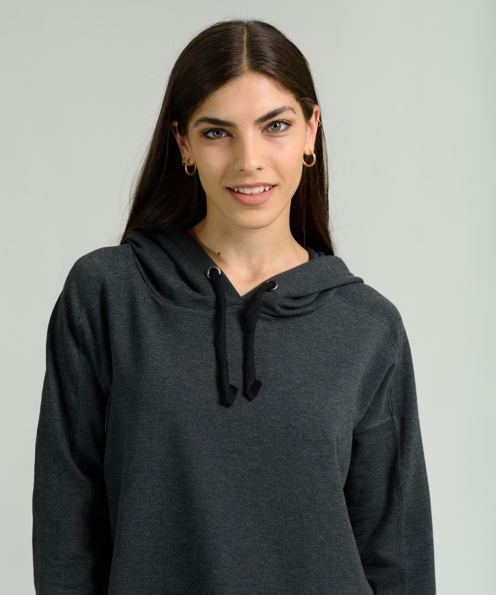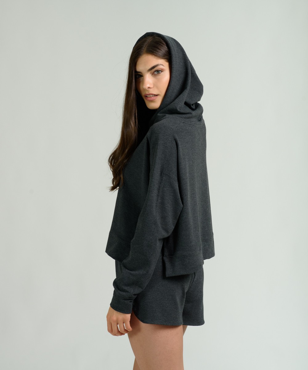 Buzo oversize con capucha y aberturas en los laterales de tejido rústico de tacto muy suave. Corte amplio con hombros caídos. Largo de cuerpo a la primera cadera. Bordado en el lateral.