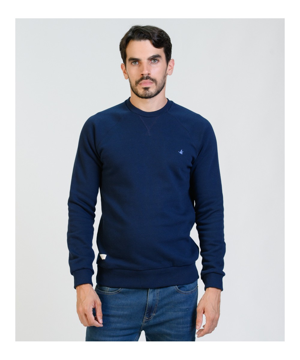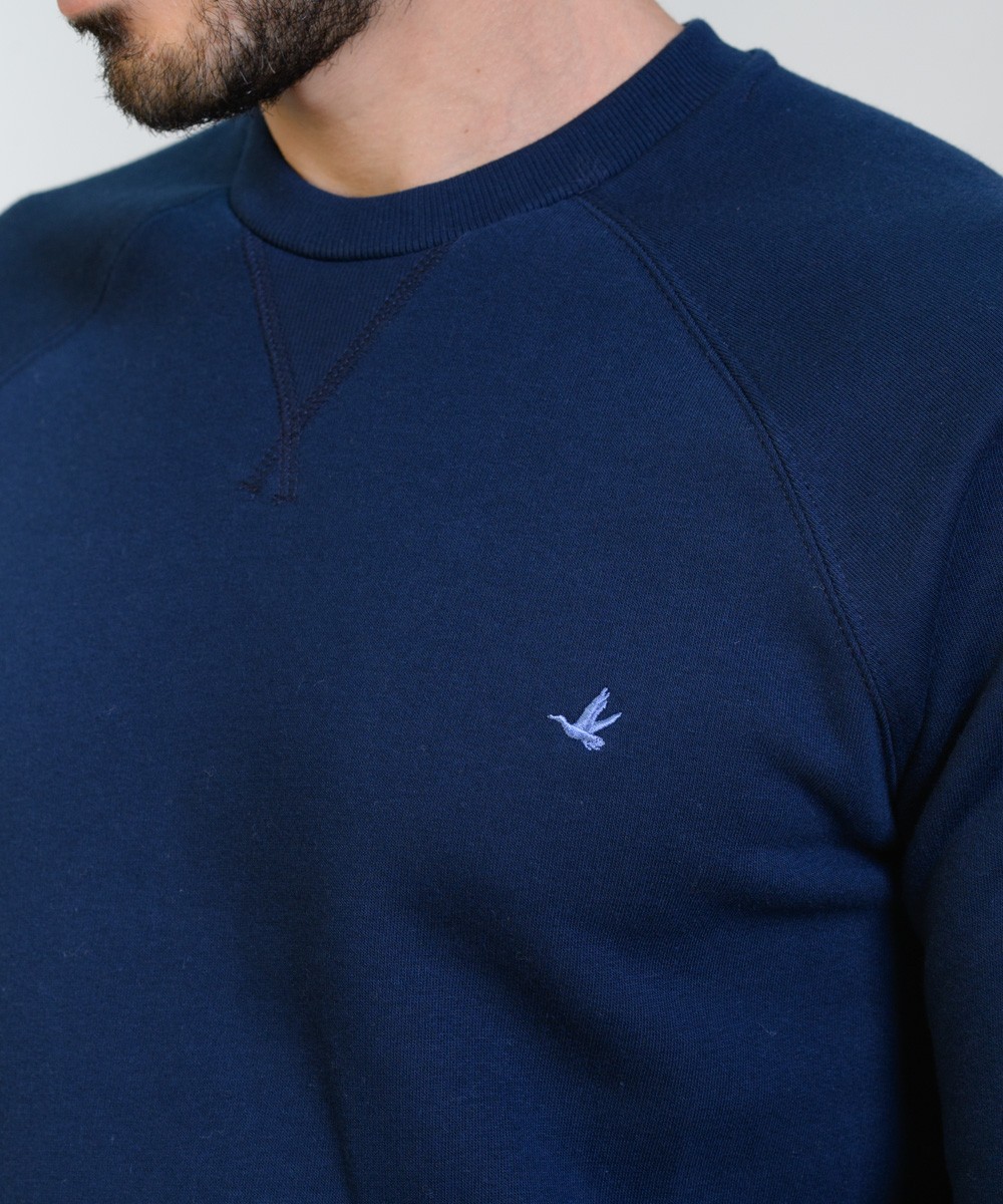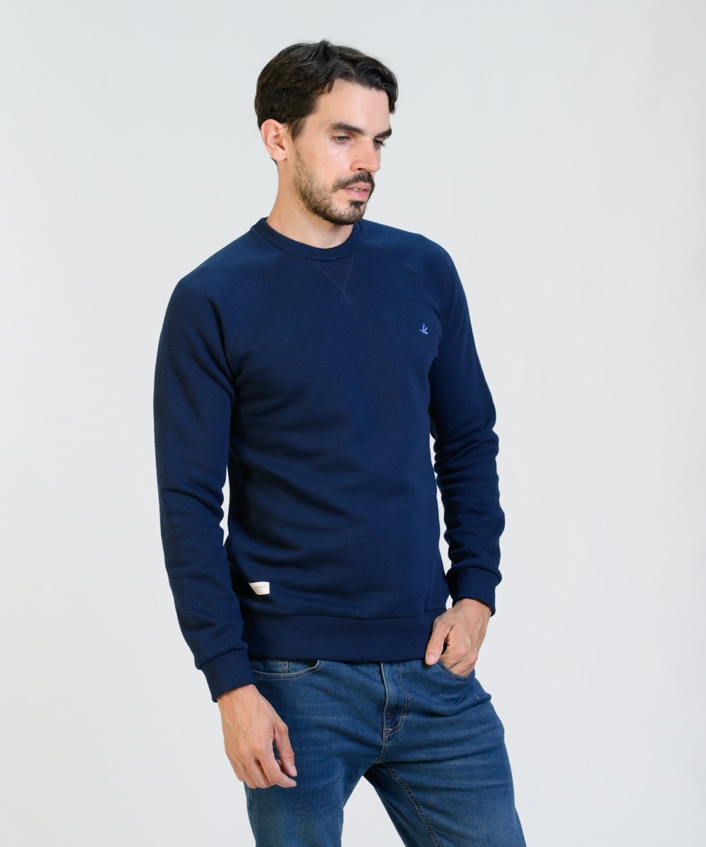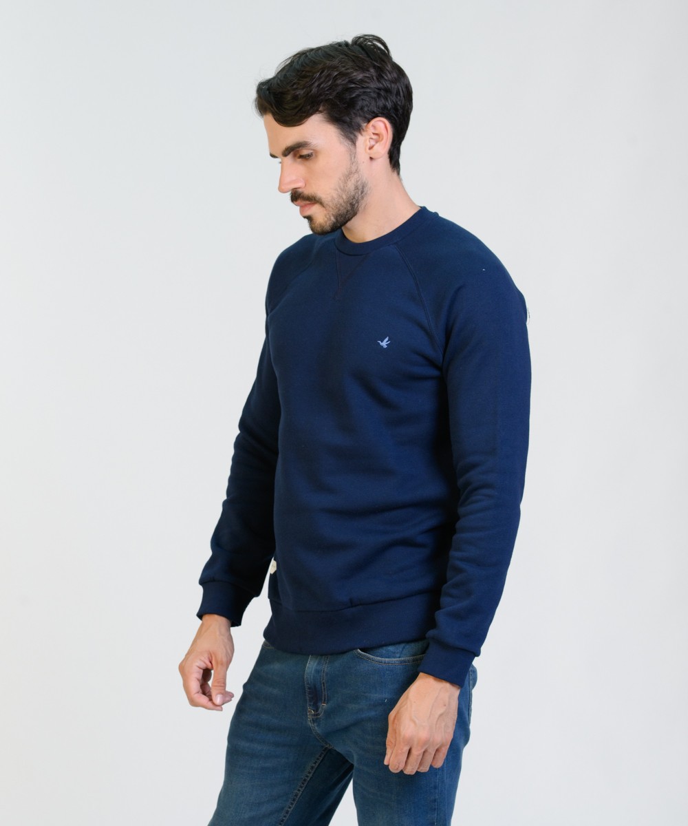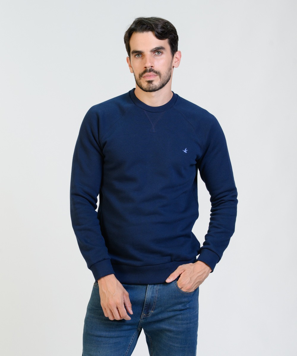 Buzo cuello redondo con manga ranglan de algodón frisado de muy buen gramaje peso densidad. Realizada con materiales y confección de primera calidad, excelente calce. Puños y cintura de reeb elástico. Logo bordado en el frente en tono celeste y grifa marcaria aplicada en el delantero.
