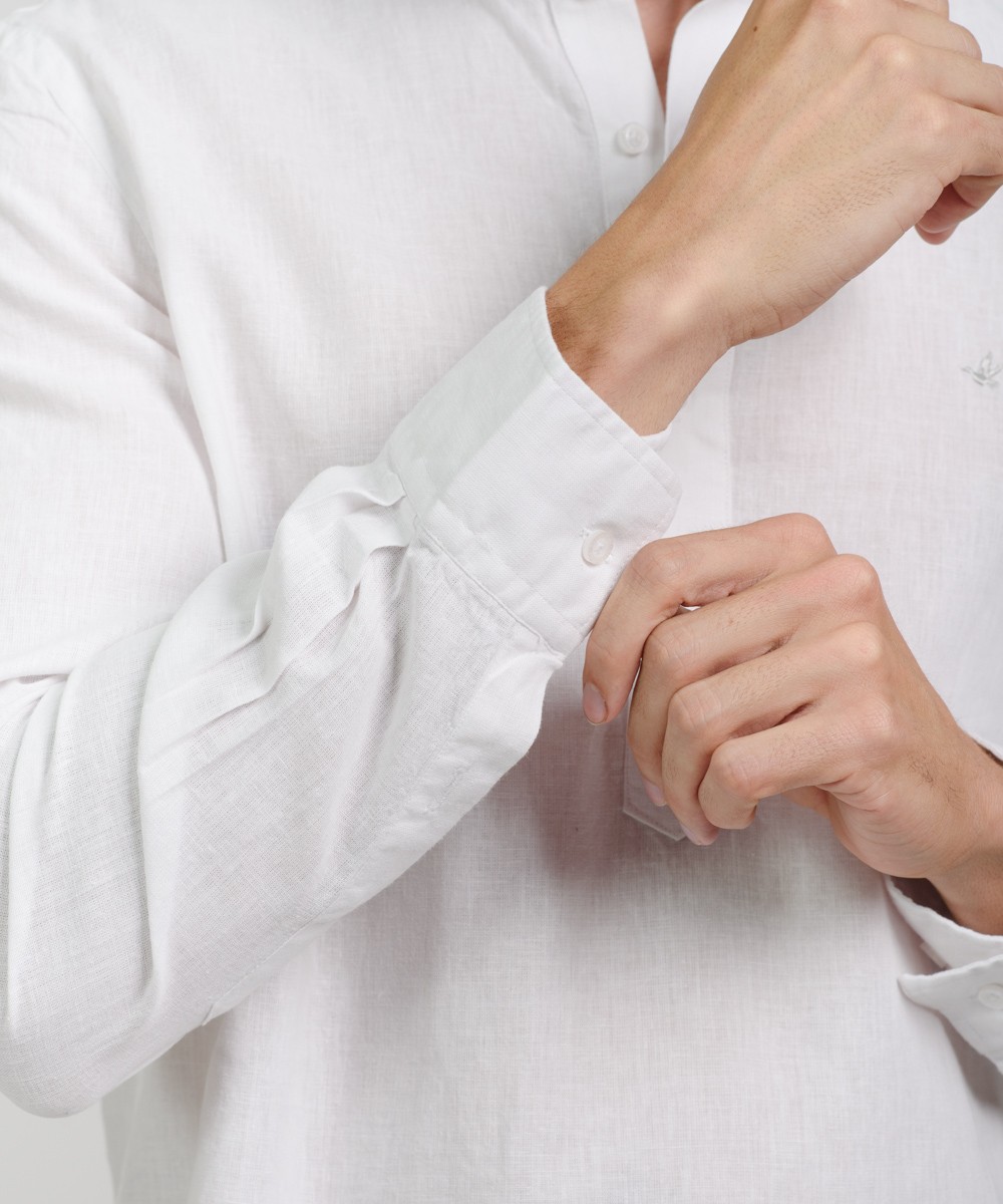 Camisa de lino con cuello mao y cartera media. Confeccionada en el mejor lino, transmite frescura y elegancia natural. Su diseño minimalista y el logo bordado en el pecho aporta distinción relajada, ideal para un look sofisticado y relajado.
