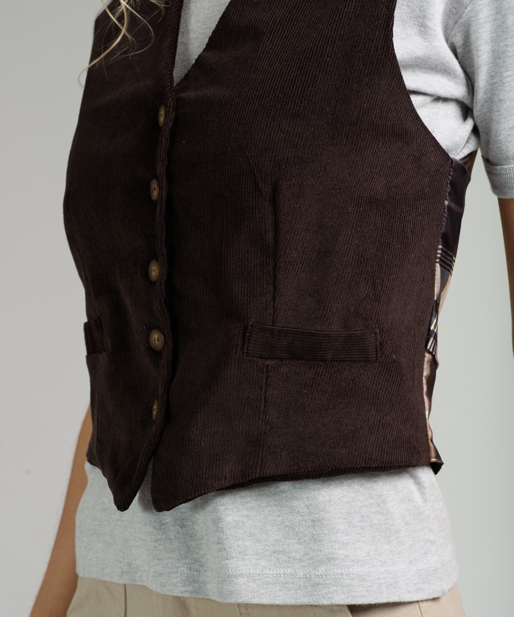 Chaleco de corderoy de basta fina en algodón con elastano. Entallado en cintura y tirilla con regulación en espalda. Forrado en su totalidad con un diseño a cuadros.