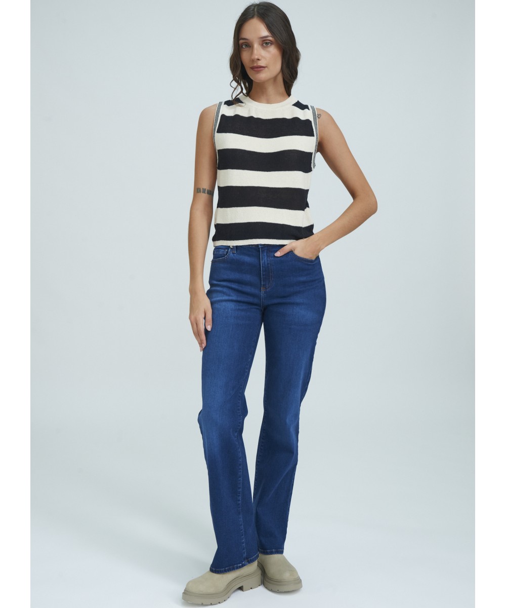 Top tejido en algodón liviano con diseño a rayas horizontales y cuello redondo. De silueta levemente suelta, incorpora un delicado aplique metálico marcario en el ruedo que aporta un detalle distintivo. Una prenda versátil y fresca, ideal para media estación, tanto de día como de noche.
