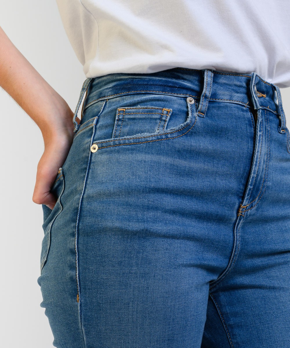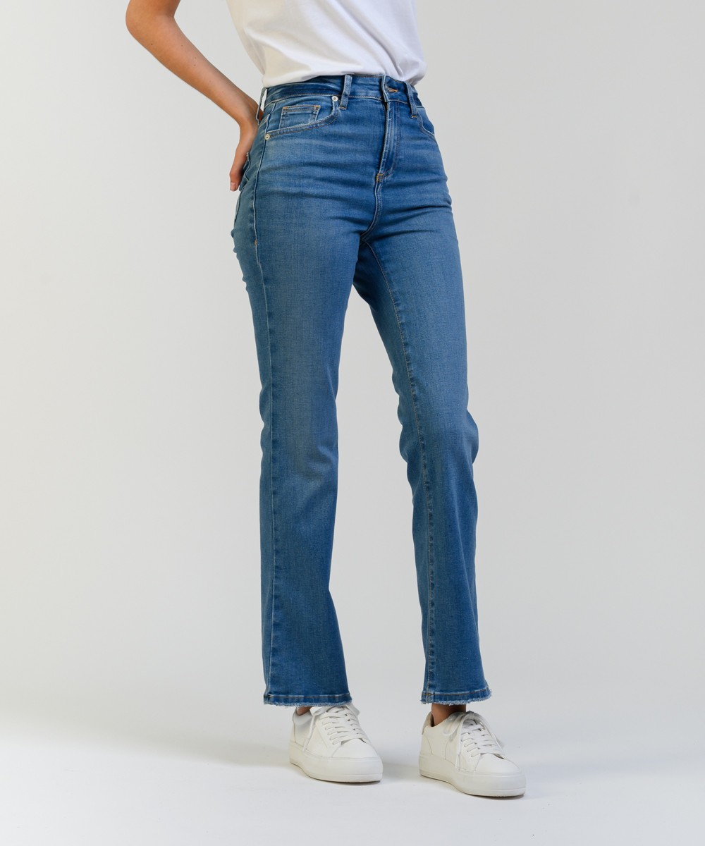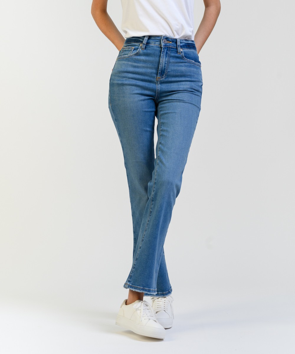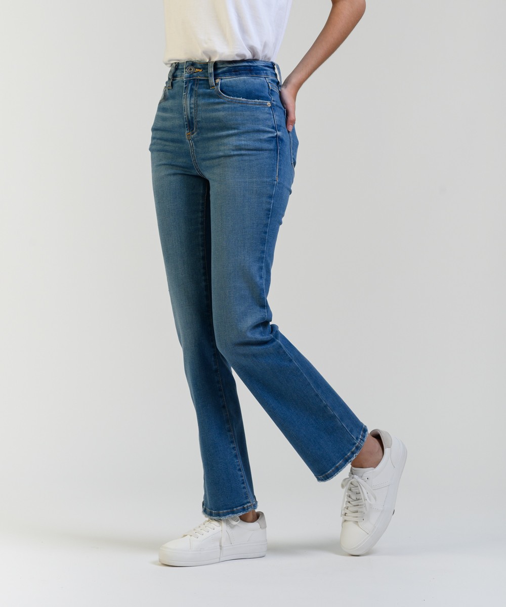 Este jean tiene un calce de pierna recta o ligeramente acampanada. Su talle es alto, ajustado en la cintura y caderas, y se ensancha ligeramente desde la rodilla hacia abajo, mientras que su pre lavado y los bigotes en la parte frontal aportan un acabado auténtico y estilizado. Está confeccionado en denim de algodón con mix de hilados brindando una combinación ideal de resistencia, suavidad y elasticidad para mayor confort. El largo llega hasta los tobillos y presenta un dobladillo ligeramente deshilachado, al igual que en los bolsillos traseros agregando un toque desenfadado y actual.