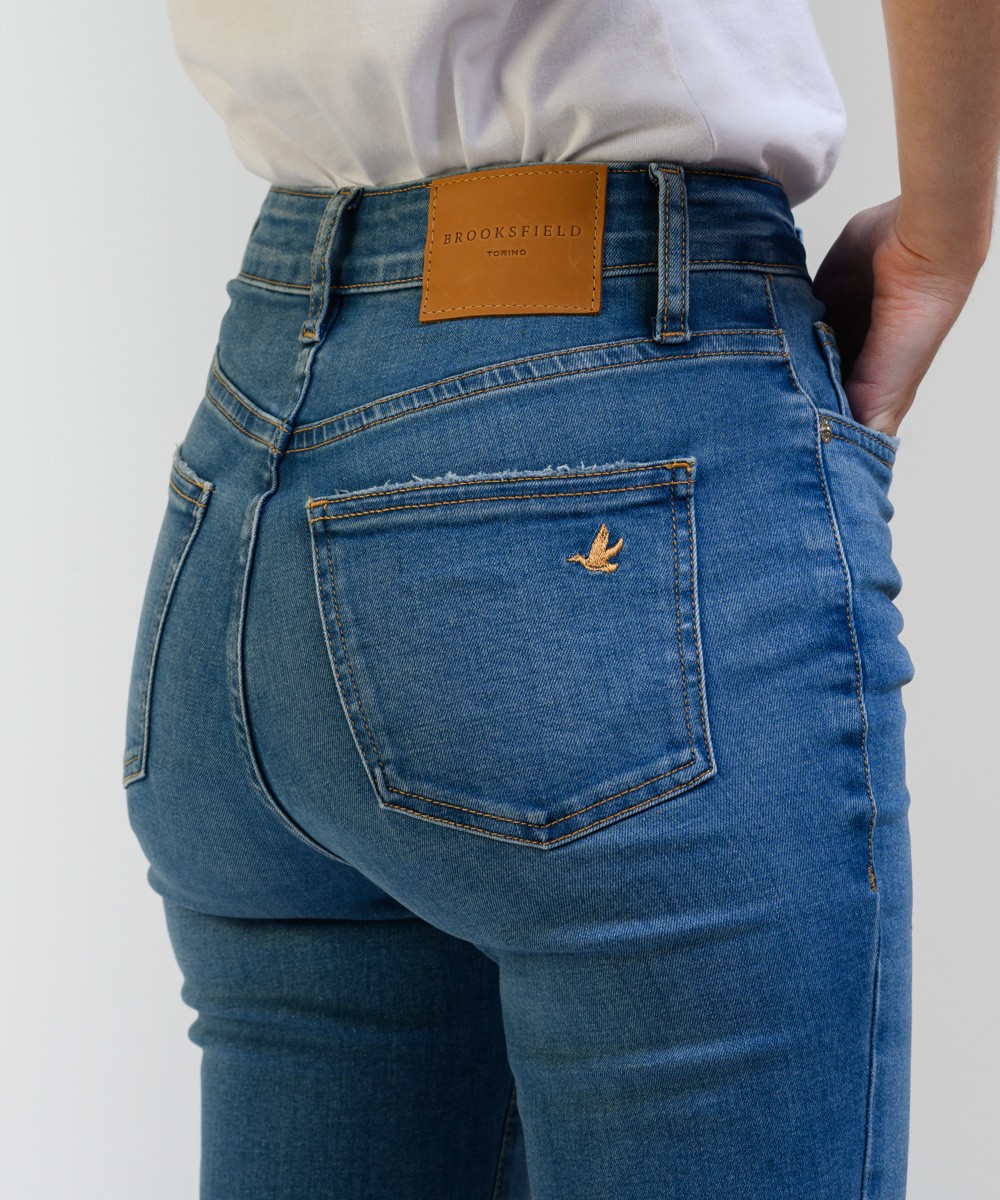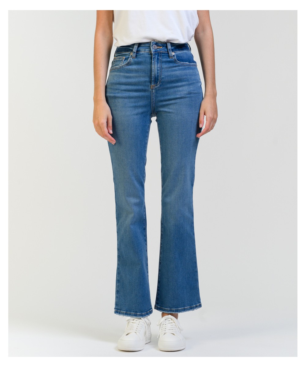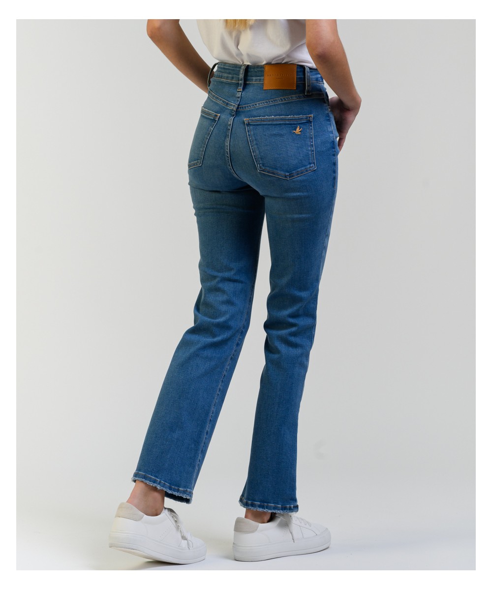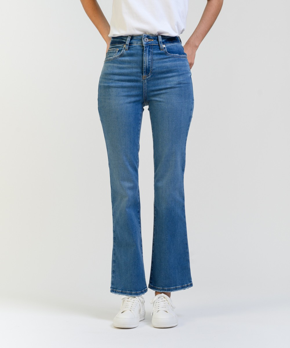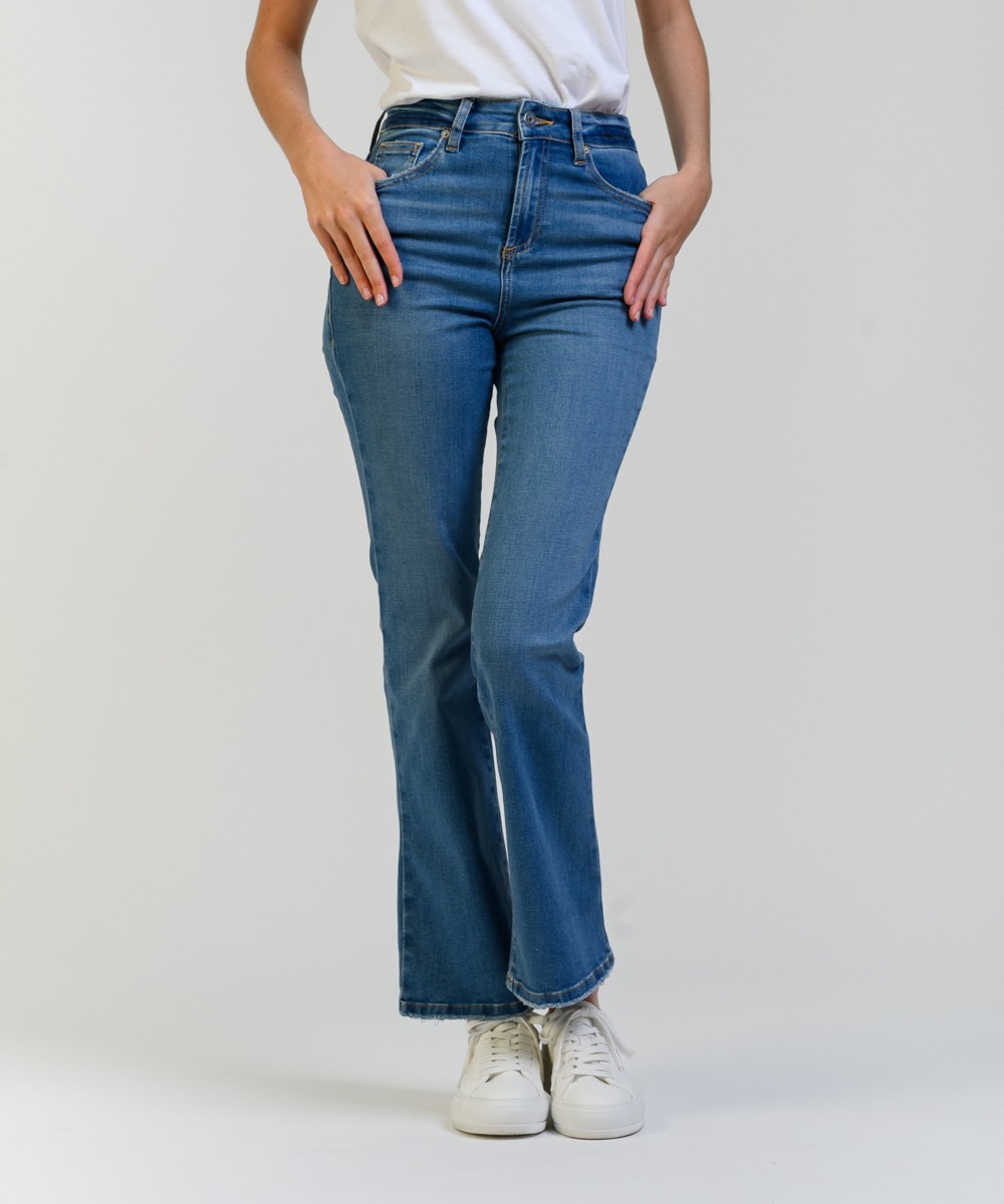Este jean tiene un calce de pierna recta o ligeramente acampanada. Su talle es alto, ajustado en la cintura y caderas, y se ensancha ligeramente desde la rodilla hacia abajo, mientras que su pre lavado y los bigotes en la parte frontal aportan un acabado auténtico y estilizado. Está confeccionado en denim de algodón con mix de hilados brindando una combinación ideal de resistencia, suavidad y elasticidad para mayor confort. El largo llega hasta los tobillos y presenta un dobladillo ligeramente deshilachado, al igual que en los bolsillos traseros agregando un toque desenfadado y actual.