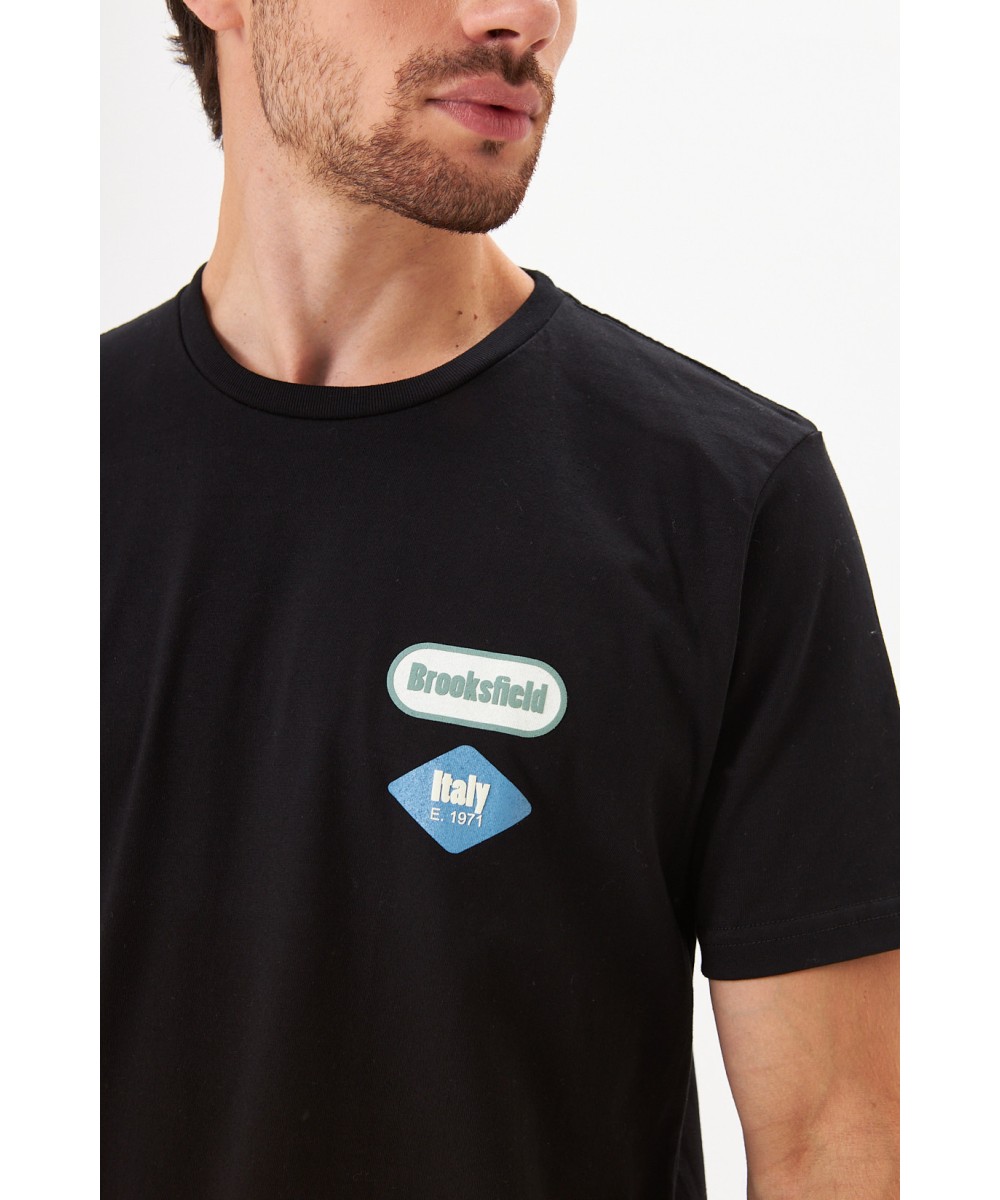 Remera de jersey de alta calidad con estampa sectorizada en el pecho. Corte recto clásico, manga corta y cuello redondo. Grifa marcaria en ruedo.