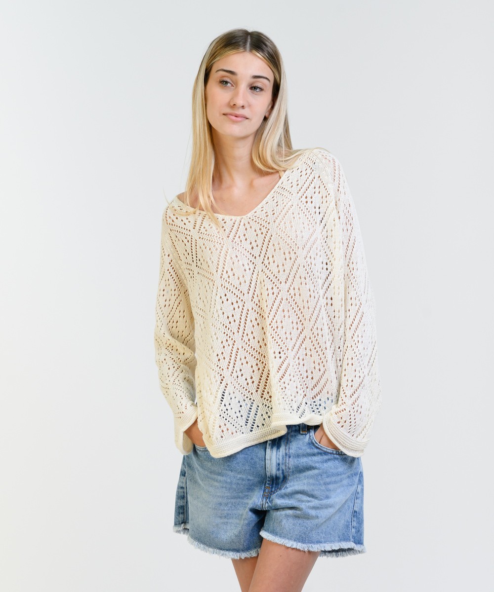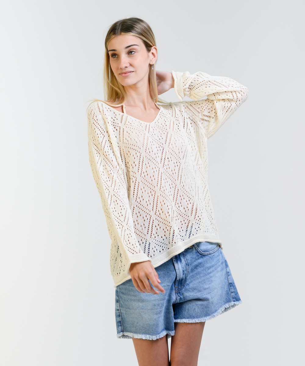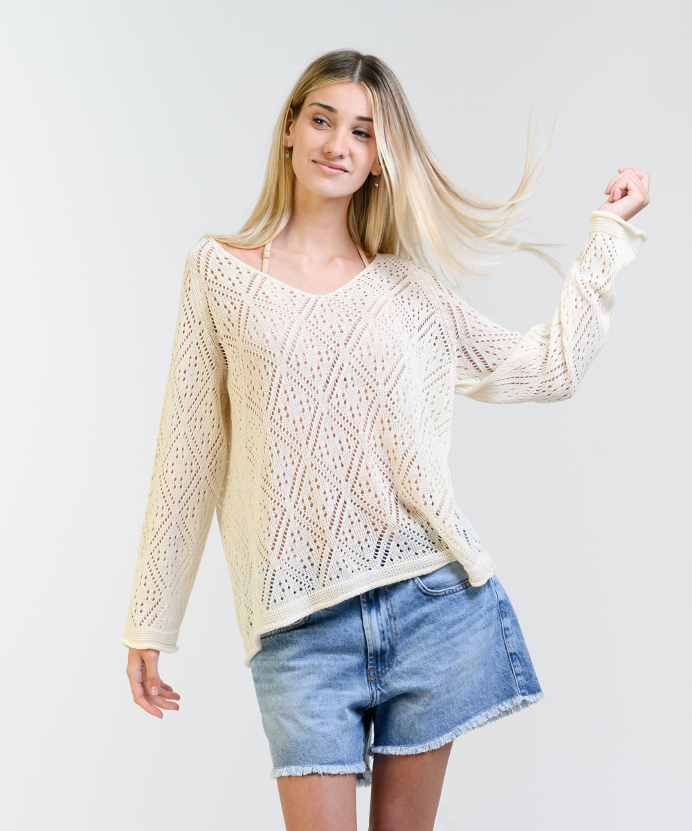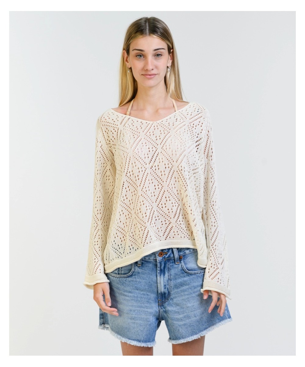 Liviano, con textura y aire bohemio. Este sweater tejido tiene un diseño calado con patrón de rombos que aporta ritmo visual sin perder sobriedad. Las mangas largas y el escote amplio lo hacen ideal para superponer sobre bikinis, tops o prendas al cuerpo. El tejido tiene caída suave y acompaña el movimiento con naturalidad. Perfecto para días de sol, playa o looks relajados con personalidad.