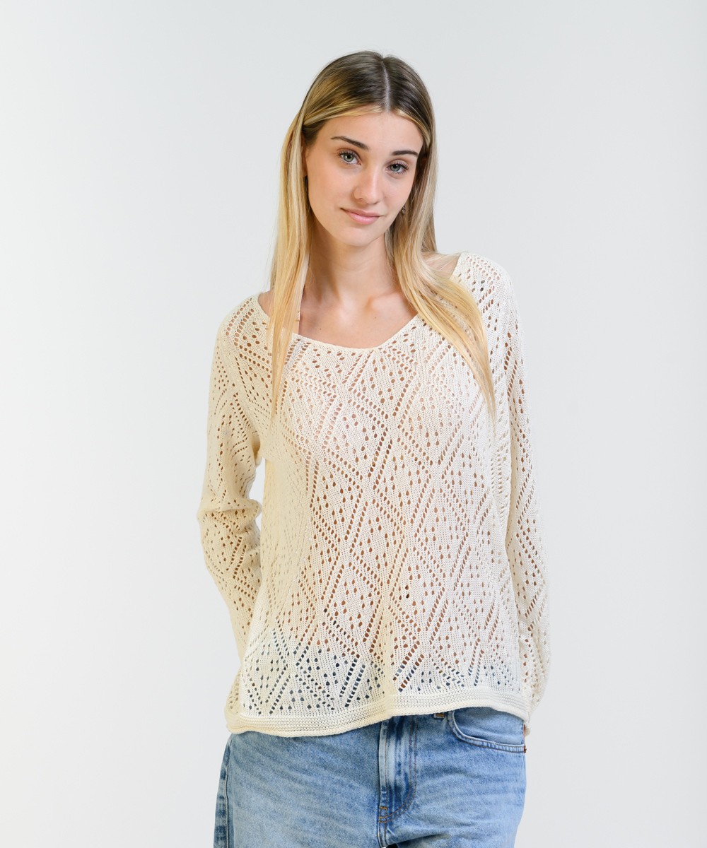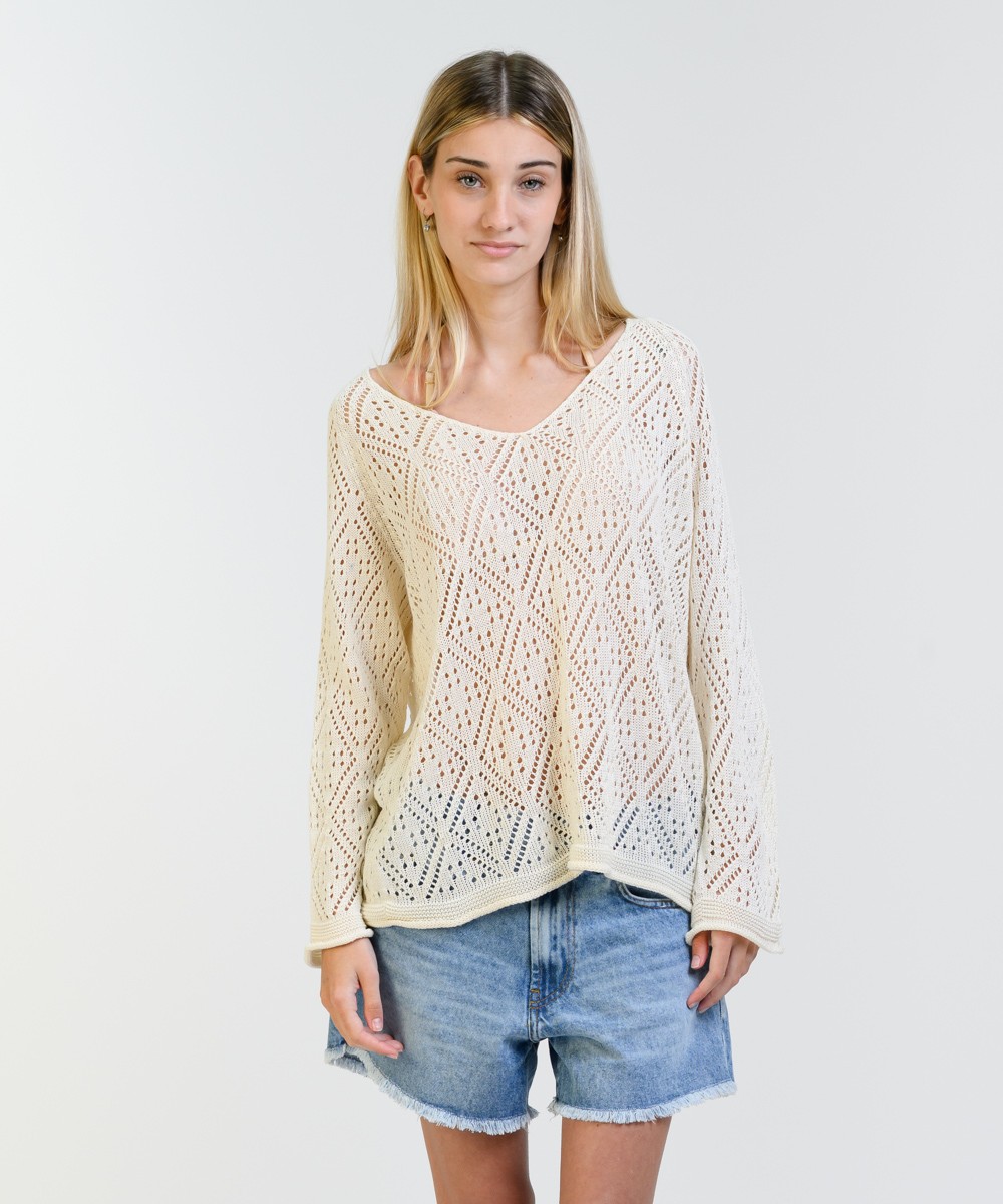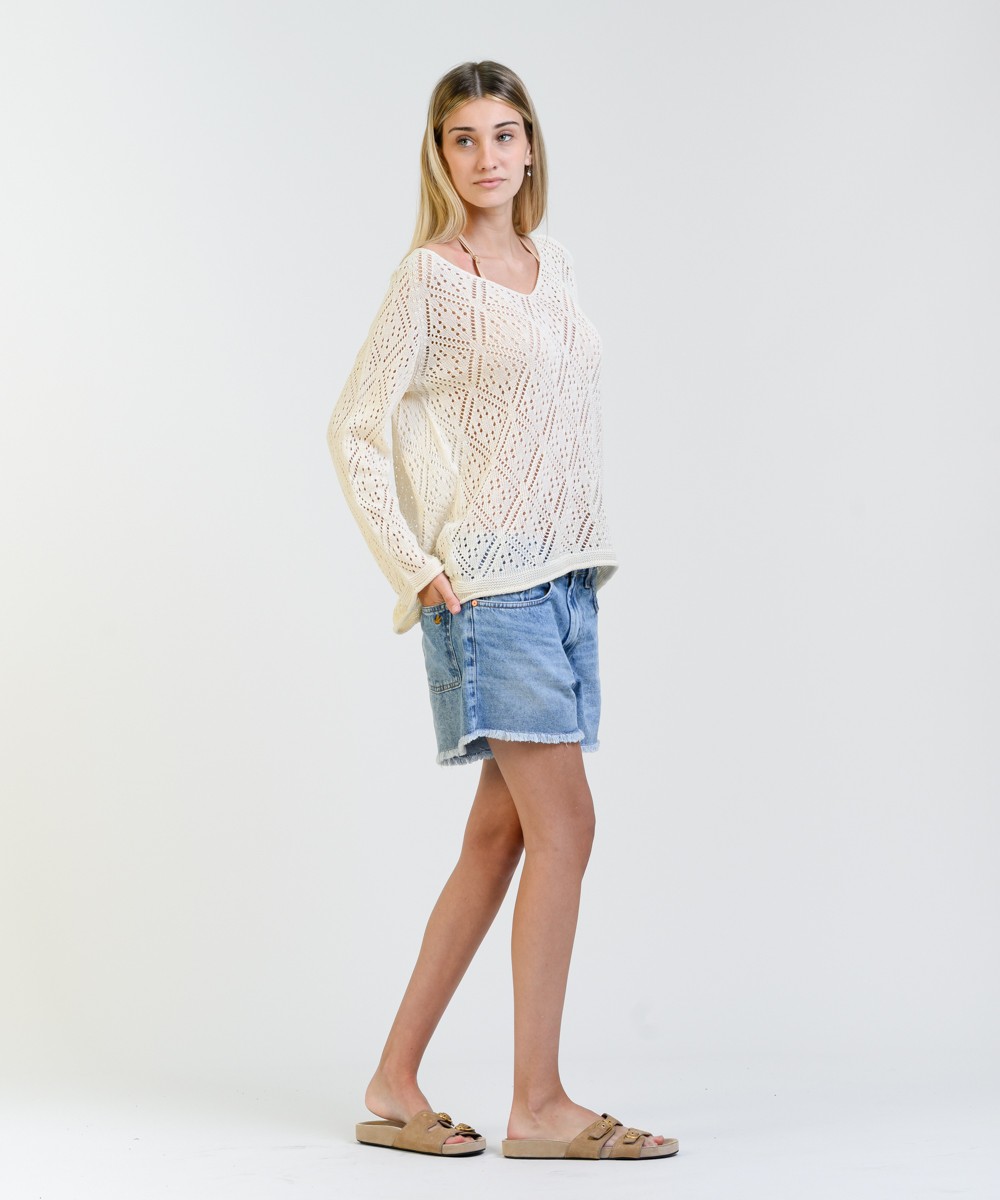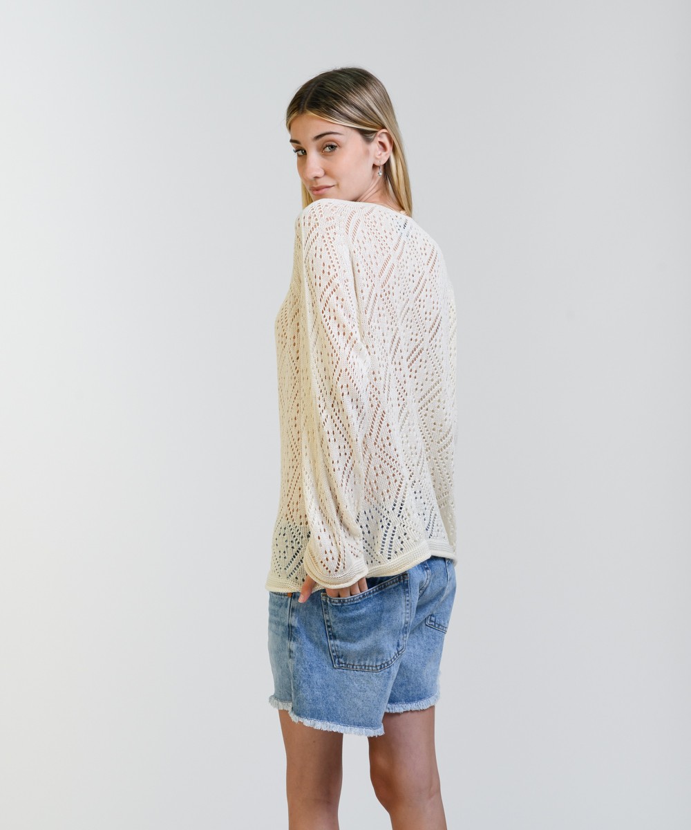 Liviano, con textura y aire bohemio. Este sweater tejido tiene un diseño calado con patrón de rombos que aporta ritmo visual sin perder sobriedad. Las mangas largas y el escote amplio lo hacen ideal para superponer sobre bikinis, tops o prendas al cuerpo. El tejido tiene caída suave y acompaña el movimiento con naturalidad. Perfecto para días de sol, playa o looks relajados con personalidad.
