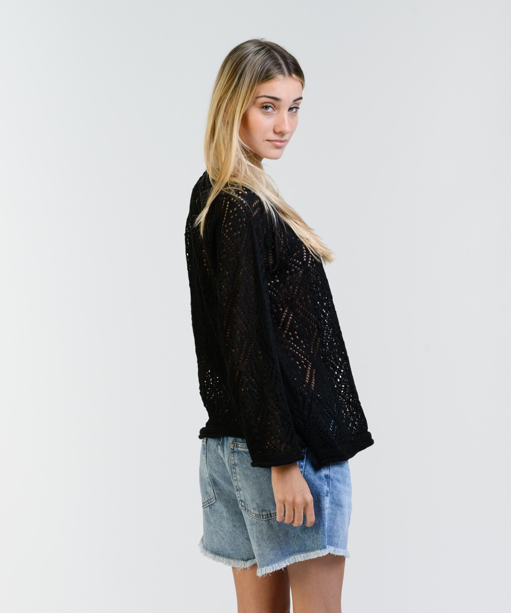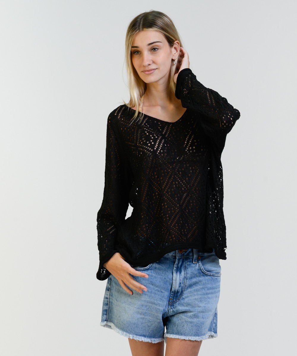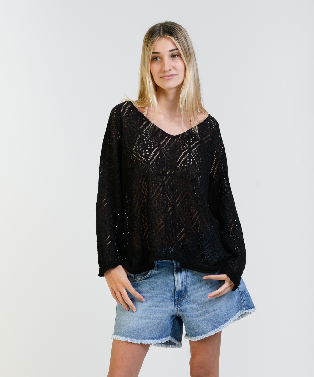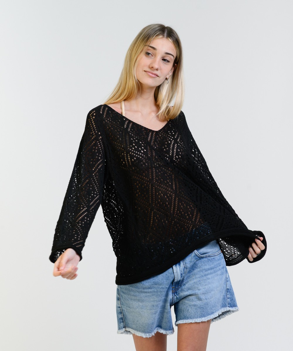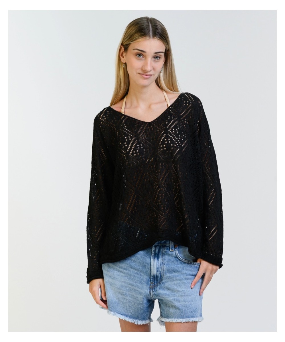 Liviano, con textura y aire bohemio. Este sweater tejido tiene un diseño calado con patrón de rombos que aporta ritmo visual sin perder sobriedad. Las mangas largas y el escote amplio lo hacen ideal para superponer sobre bikinis, tops o prendas al cuerpo. El tejido tiene caída suave y acompaña el movimiento con naturalidad. Perfecto para días de sol, playa o looks relajados con personalidad.