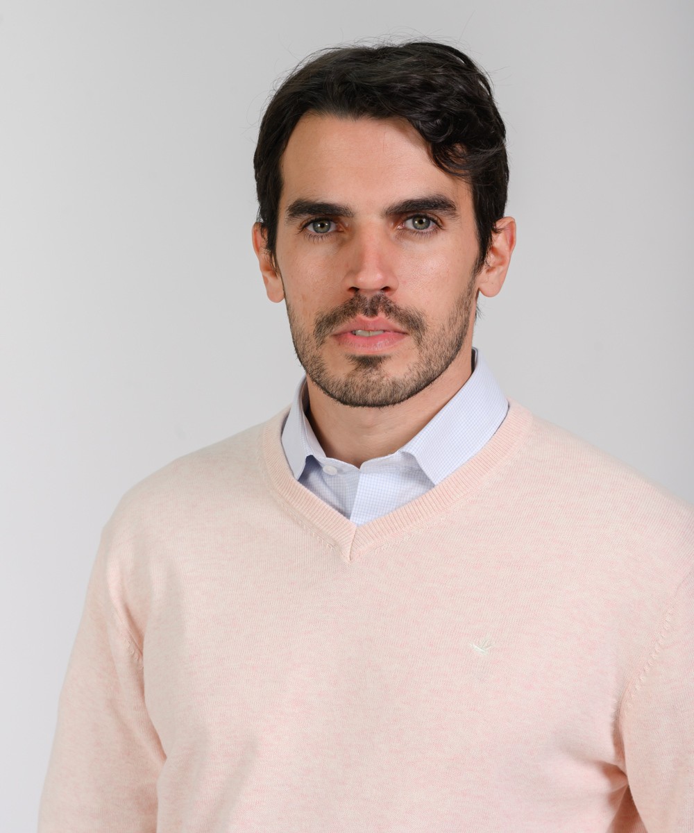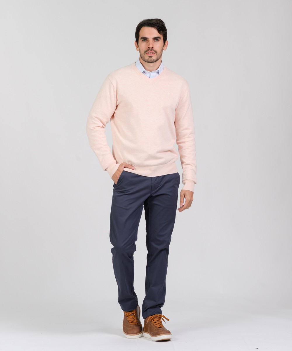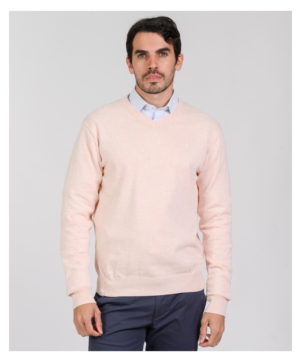 Sweater en hilado 100% algodón con un lavado suavizado. Abrigo ligero excelente para usar en cualquier temporada del año. Suave textura melange. Su corte es clásico con un calce regular moderno. Con escote en V a la base, puños y cintura tejidos en punto acanalado. Logo de la marca bordado en el frente y grifa marcaria en el ruedo.