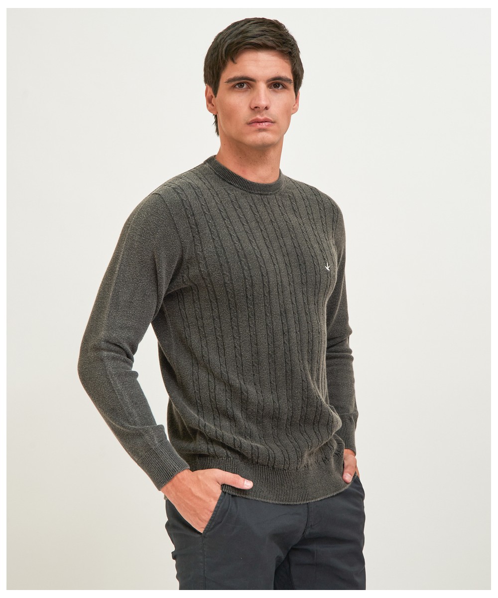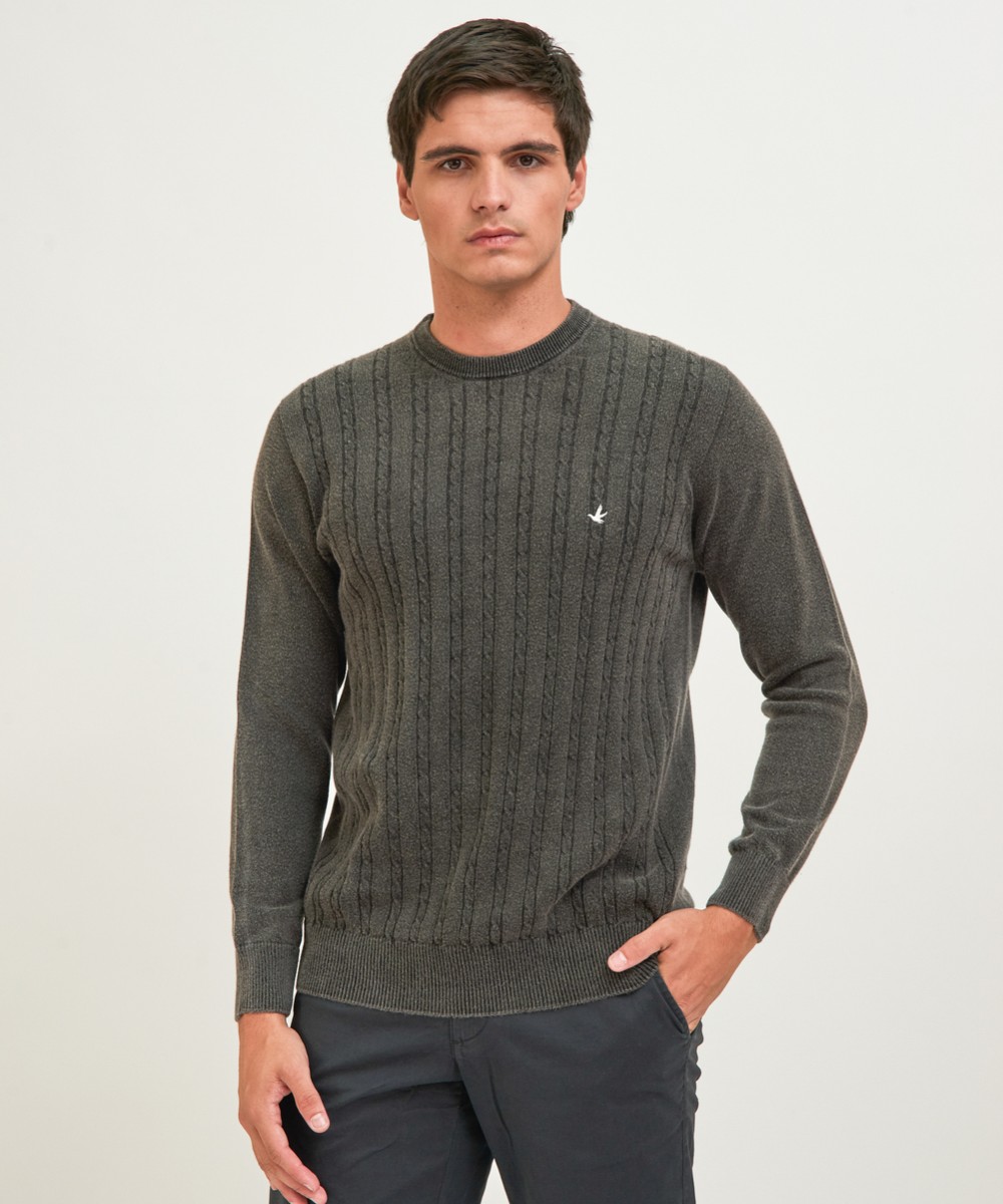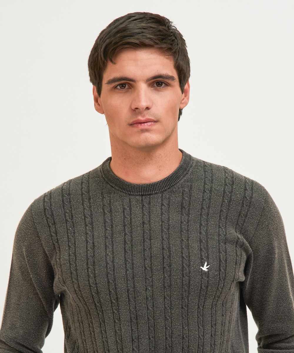 Sweater 100% algodón en punto jersey, con frente trabajado en tejido de trenzas que aporta relieve. El proceso de gastado realza la textura y le otorga un aspecto auténtico y versátil. Su diseño atemporal combina suavidad al tacto con estructura equilibrada, logrando una caída natural y ligera. El logo bordado en el pecho suma un acento sutil y elegante, ideal para quienes buscan estilo sin excesos.