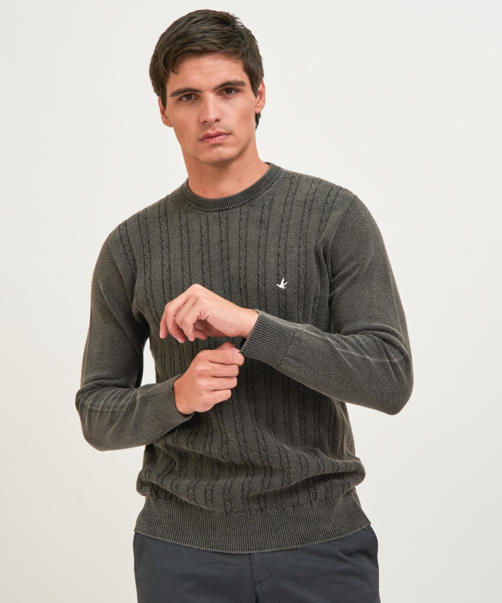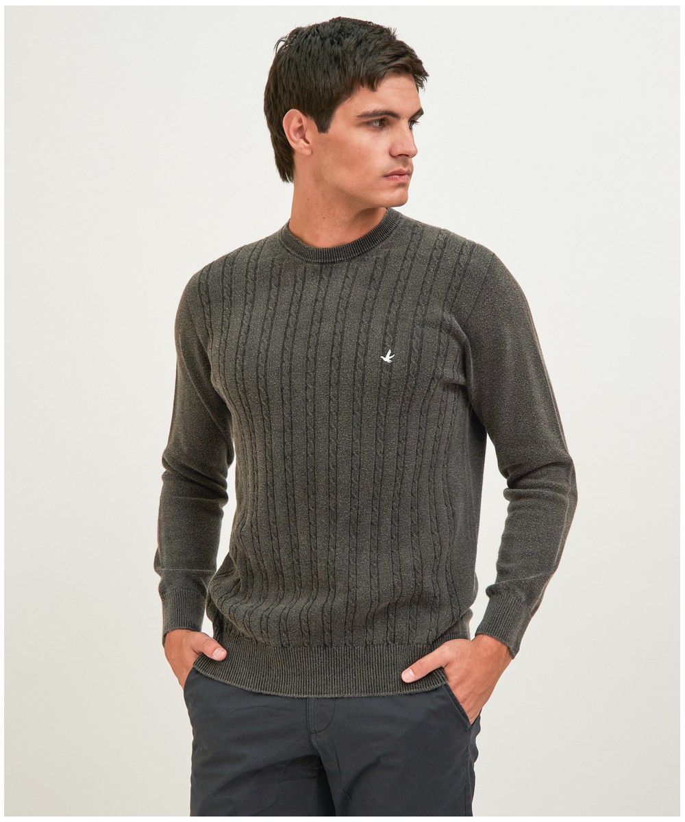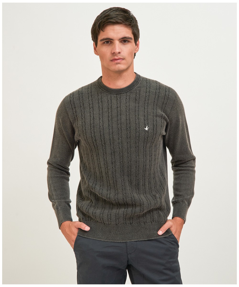 Sweater 100% algodón en punto jersey, con frente trabajado en tejido de trenzas que aporta relieve. El proceso de gastado realza la textura y le otorga un aspecto auténtico y versátil. Su diseño atemporal combina suavidad al tacto con estructura equilibrada, logrando una caída natural y ligera. El logo bordado en el pecho suma un acento sutil y elegante, ideal para quienes buscan estilo sin excesos.