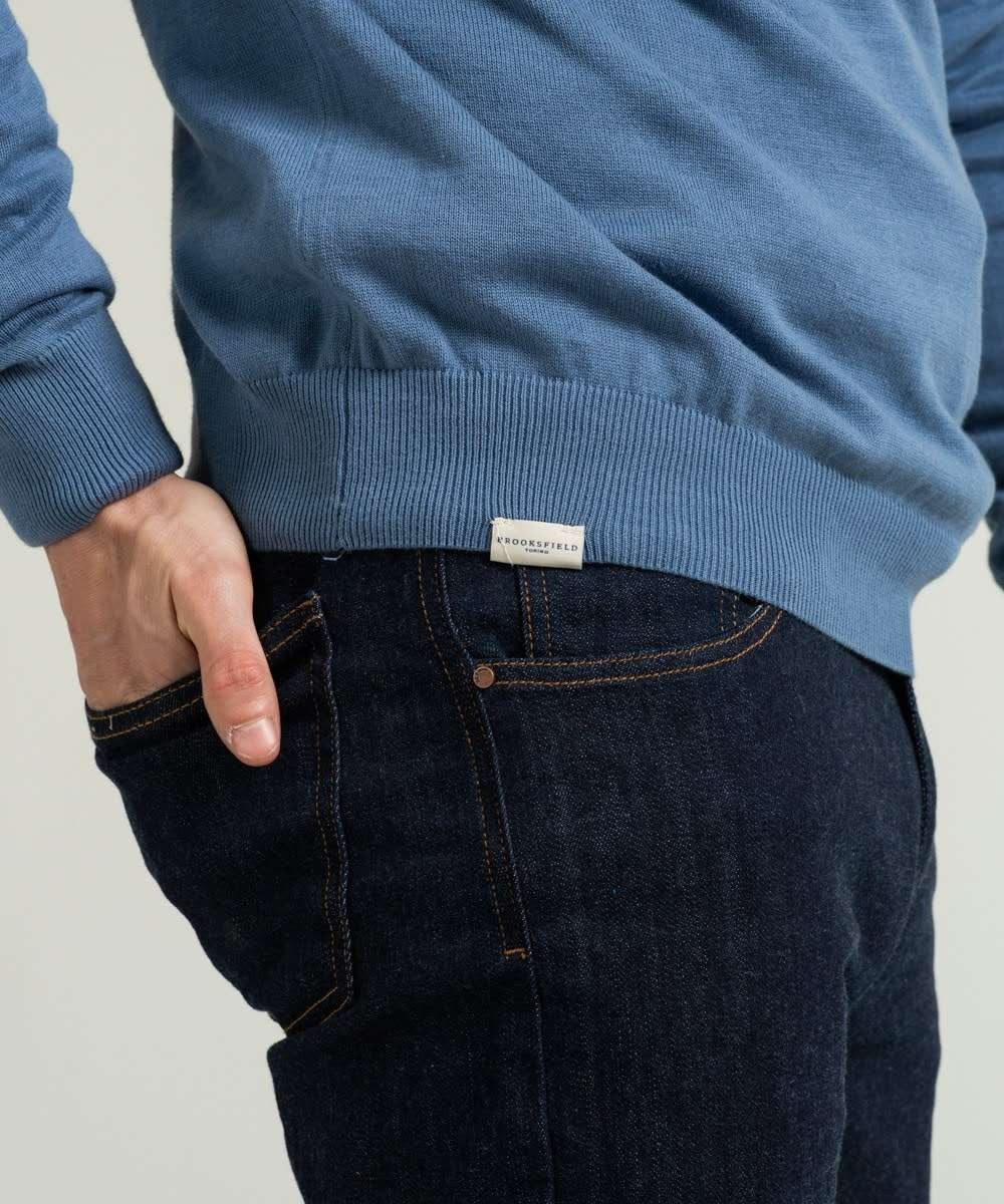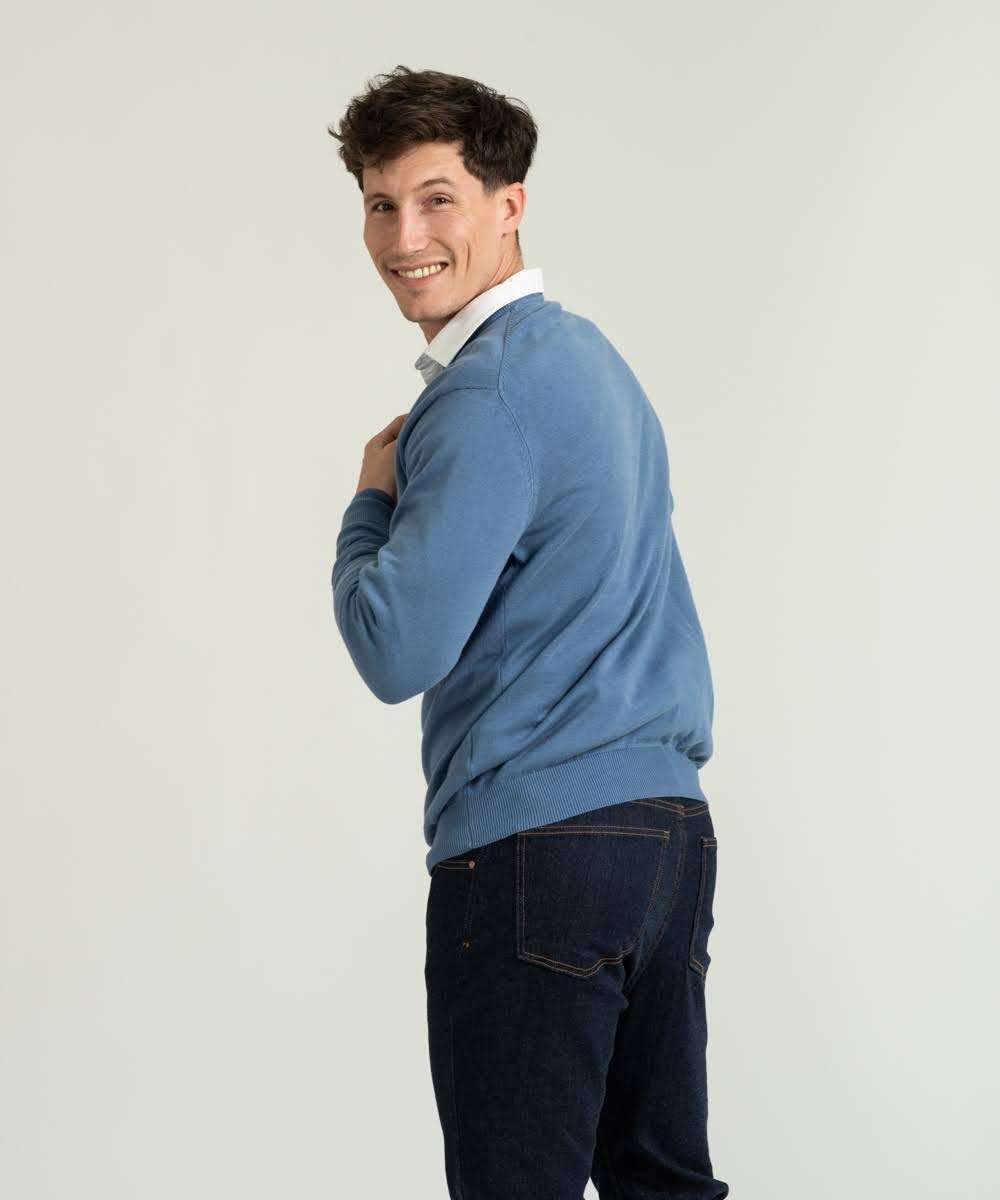 Sweater en hilado 100% algodón con un lavado suavizado. Abrigo ligero excelente para usar en cualquier temporada del año. Suave textura melange. Su corte es clásico con un calce regular moderno. Con escote en V a la base, puños y cintura tejidos en punto acanalado. Logo de la marca bordado en el frente y grifa marcaria en el ruedo.