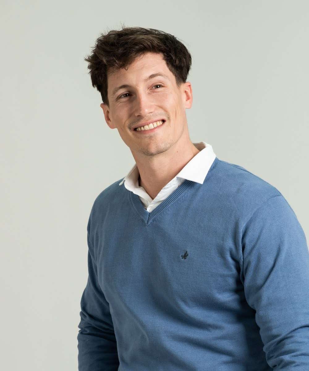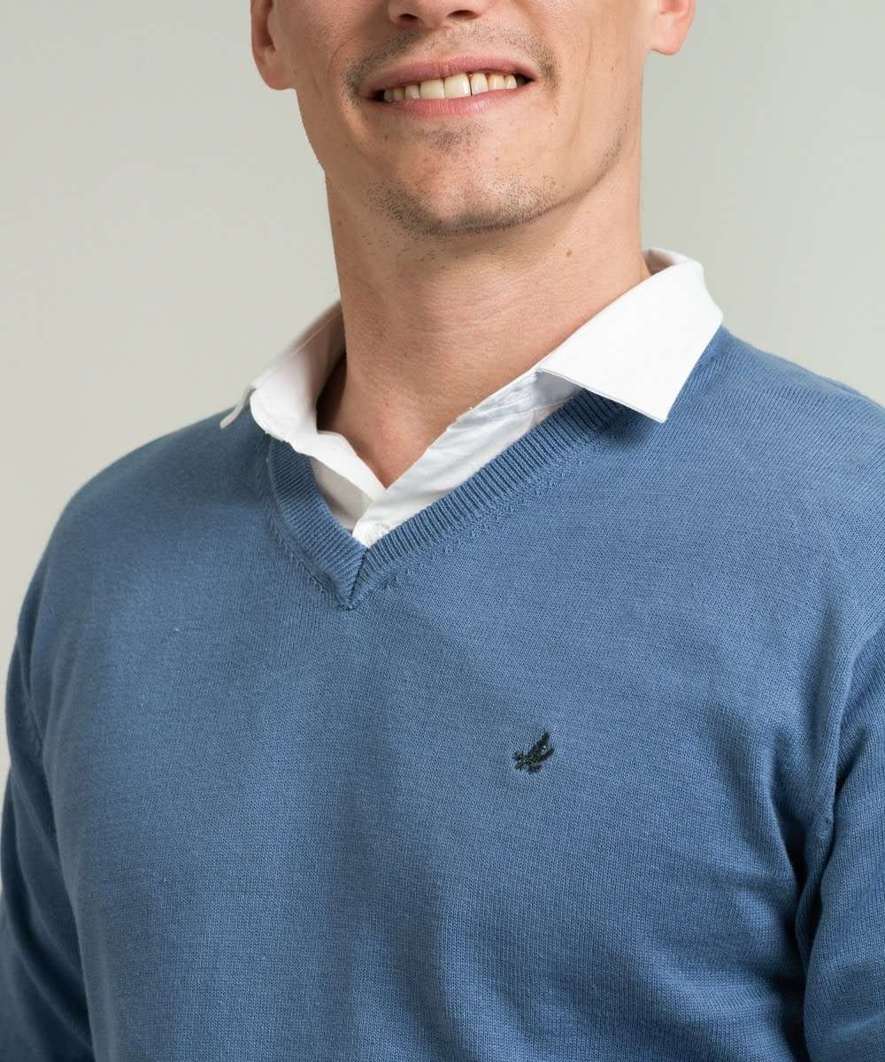 Sweater en hilado 100% algodón con un lavado suavizado. Abrigo ligero excelente para usar en cualquier temporada del año. Suave textura melange. Su corte es clásico con un calce regular moderno. Con escote en V a la base, puños y cintura tejidos en punto acanalado. Logo de la marca bordado en el frente y grifa marcaria en el ruedo.