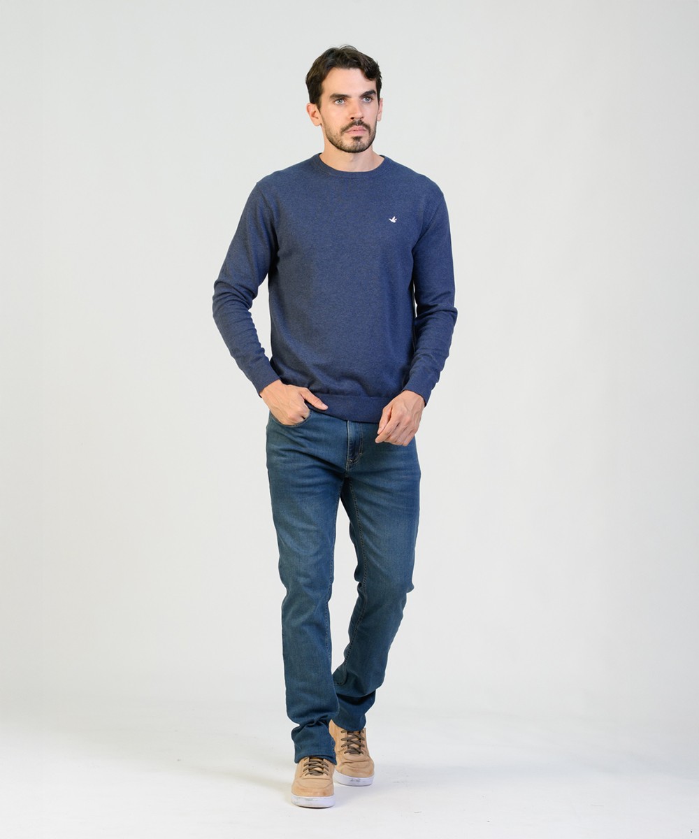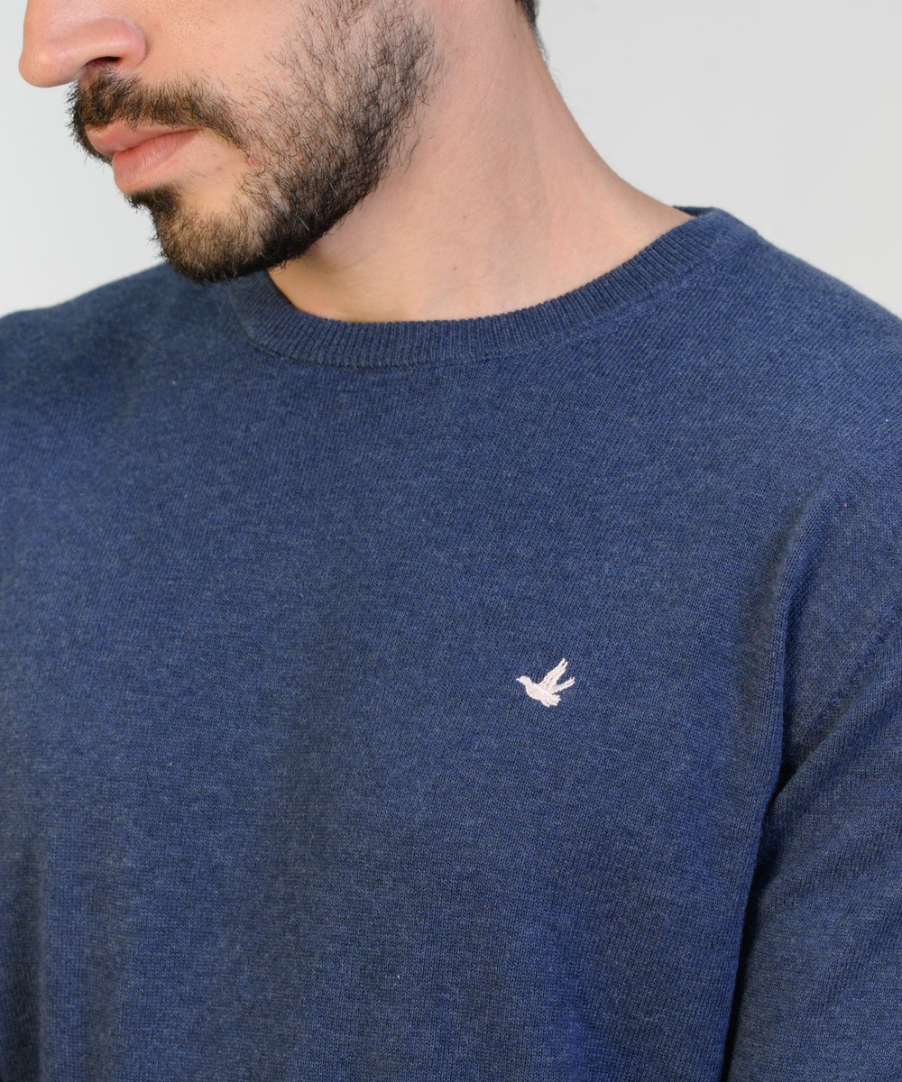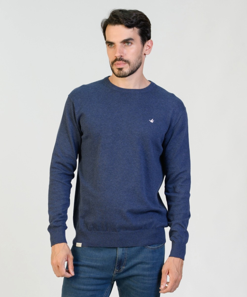 Sweater en hilado 100% algodón con un lavado suavizado. Abrigo ligero excelente para usar en cualquier temporada del año. Suave textura melange. Su corte es clásico con un calce regular moderno. Con escote redondo a la base, puños y cintura tejidos en punto acanalado. Logo de la marca bordado en el frente y grifa marcaria en el ruedo.