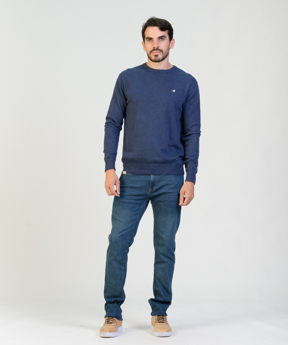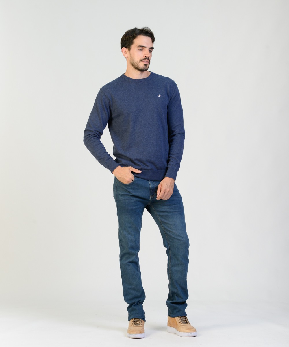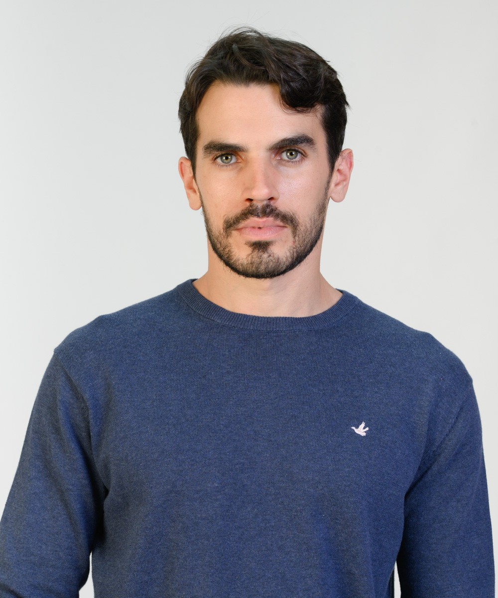 Sweater en hilado 100% algodón con un lavado suavizado. Abrigo ligero excelente para usar en cualquier temporada del año. Suave textura melange. Su corte es clásico con un calce regular moderno. Con escote redondo a la base, puños y cintura tejidos en punto acanalado. Logo de la marca bordado en el frente y grifa marcaria en el ruedo.