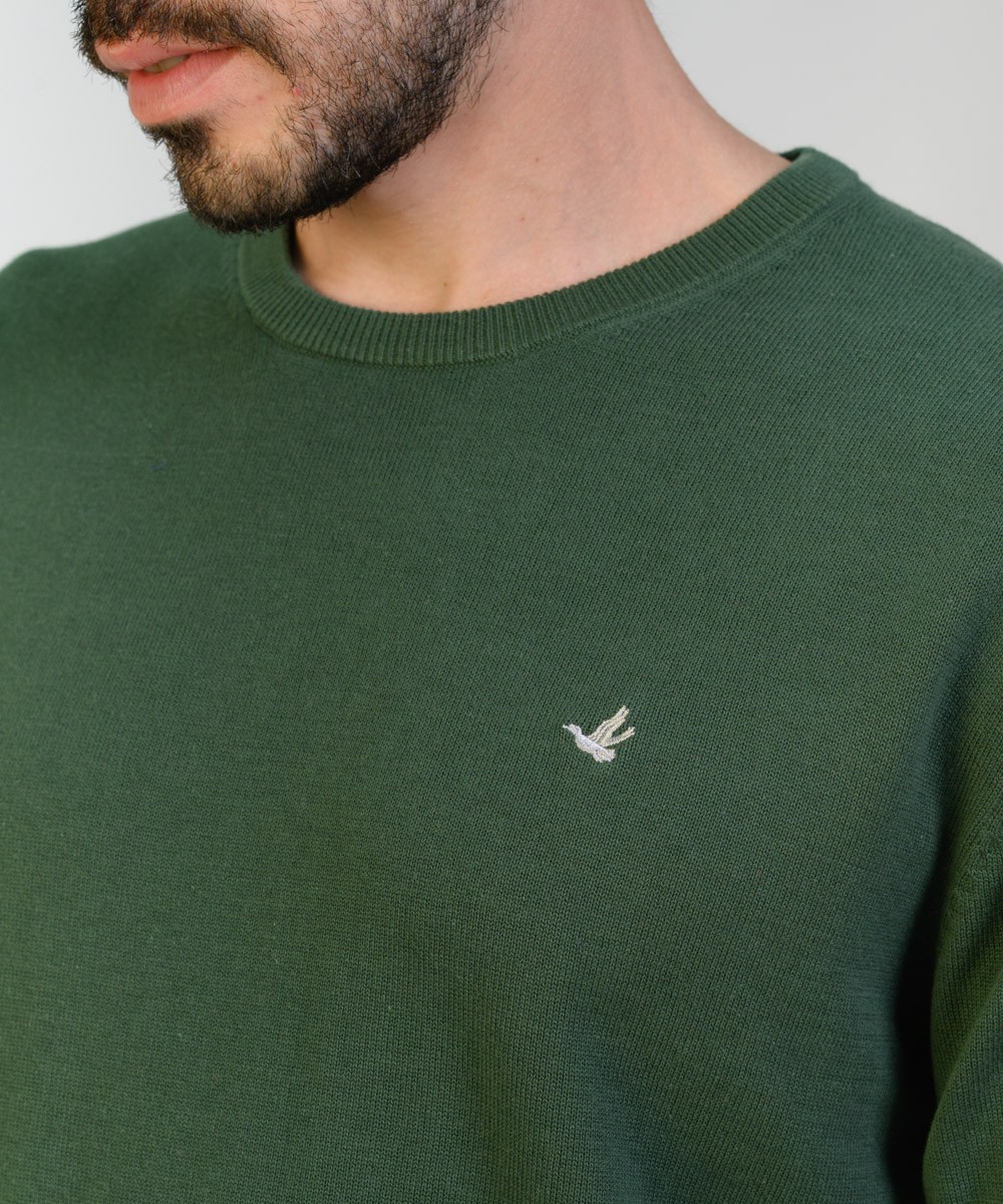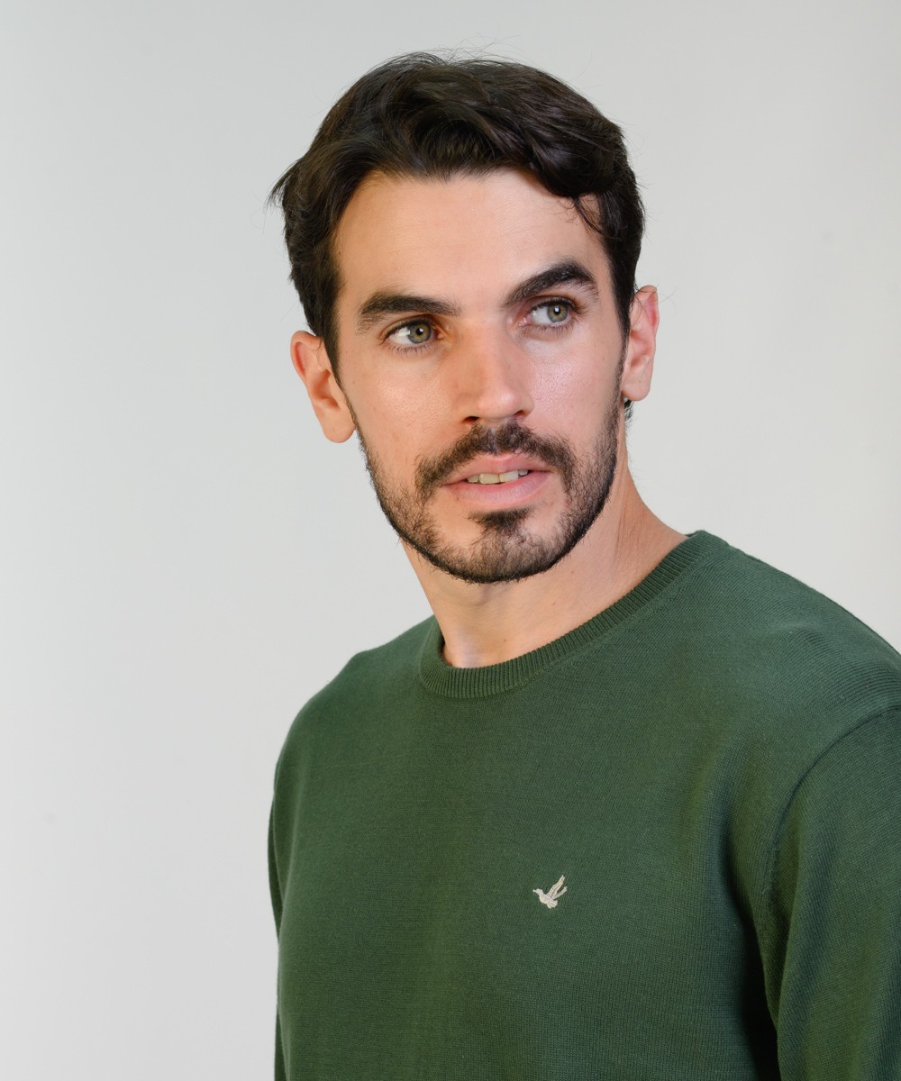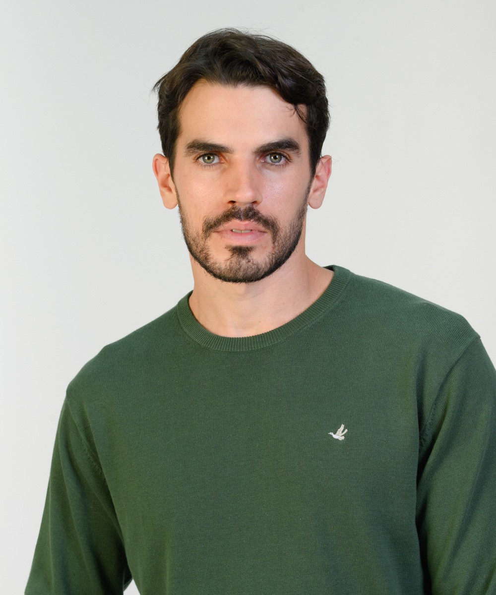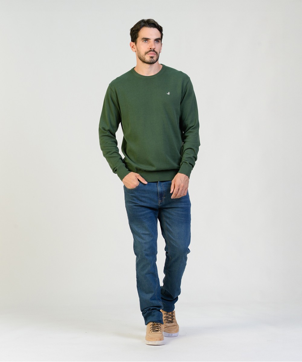 Sweater en hilado 100% algodón con un lavado suavizado. Abrigo ligero excelente para usar en cualquier temporada del año. Suave textura melange. Su corte es clásico con un calce regular moderno. Con escote redondo a la base, puños y cintura tejidos en punto acanalado. Logo de la marca bordado en el frente y grifa marcaria en el ruedo.