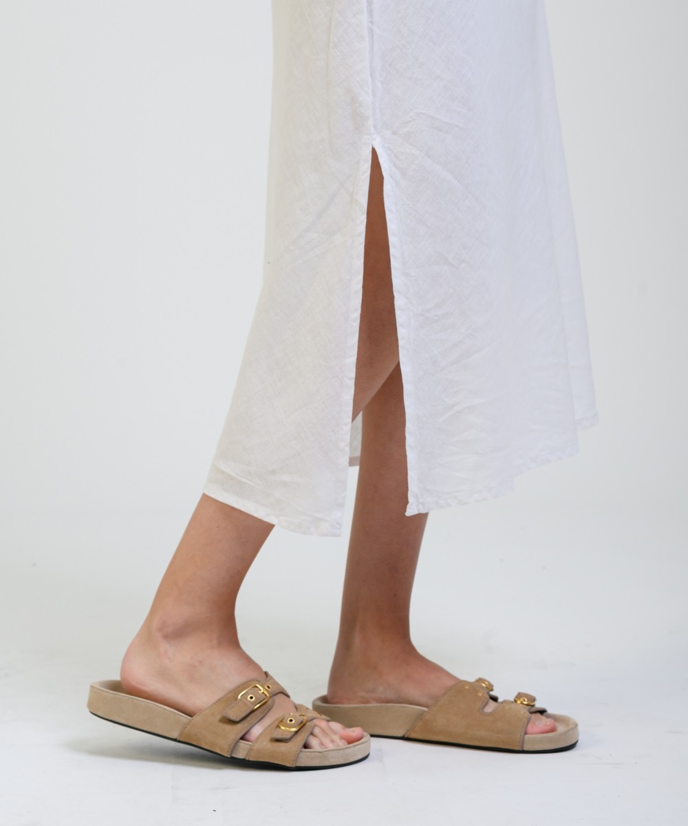 Vestido midi de lino y algodón con textura jaspeada, típico del lino, que aporta naturalidad y carácter. De corte al bies, se adapta suavemente a la silueta y acompaña el movimiento. El escote bote enmarca los hombros con elegancia y se une mediante una costura limpia solapada. Cuenta con una única abertura lateral que suma fluidez al andar y equilibra la estética minimalista del diseño. Ideal para climas cálidos y looks sofisticados de día.