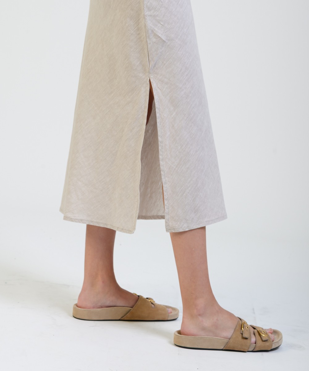 Vestido midi de lino y algodón con textura jaspeada, típico del lino, que aporta naturalidad y carácter. De corte al bies, se adapta suavemente a la silueta y acompaña el movimiento. El escote bote enmarca los hombros con elegancia y se une mediante una costura limpia solapada. Cuenta con una única abertura lateral que suma fluidez al andar y equilibra la estética minimalista del diseño. Ideal para climas cálidos y looks sofisticados de día.