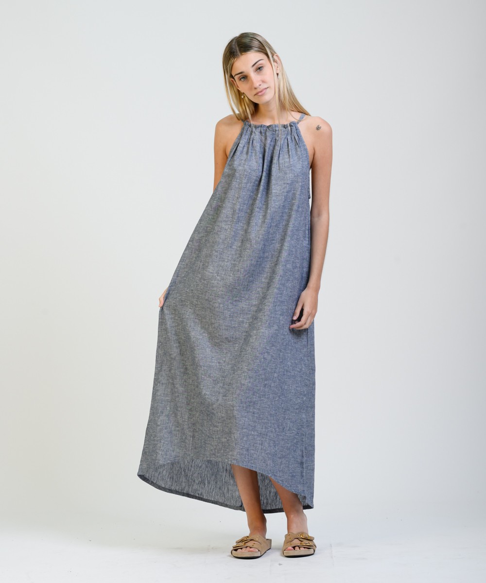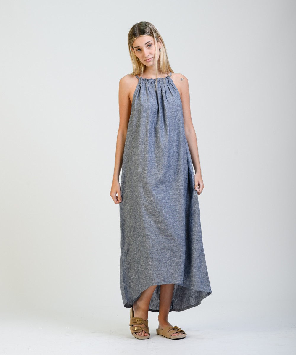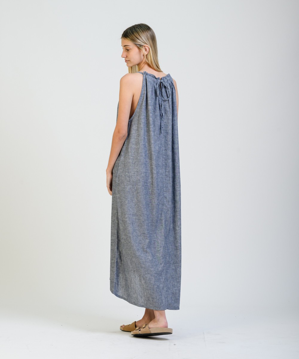 Amplio, liviano y con movimiento natural. Este vestido largo sin mangas está confeccionado en una mezcla suave de lino y algodón, con predominio de textura y frescura. El cuello fruncido se ajusta con un lazo fino en la espalda, creando una abertura sutil que suma detalle sin perder simpleza. El diseño evasé acompaña distintas siluetas con soltura, y el ruedo más largo en la parte trasera aporta fluidez de movimiento al caminar.