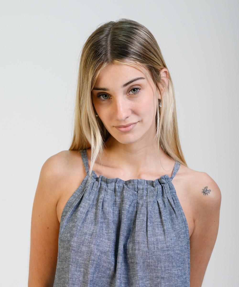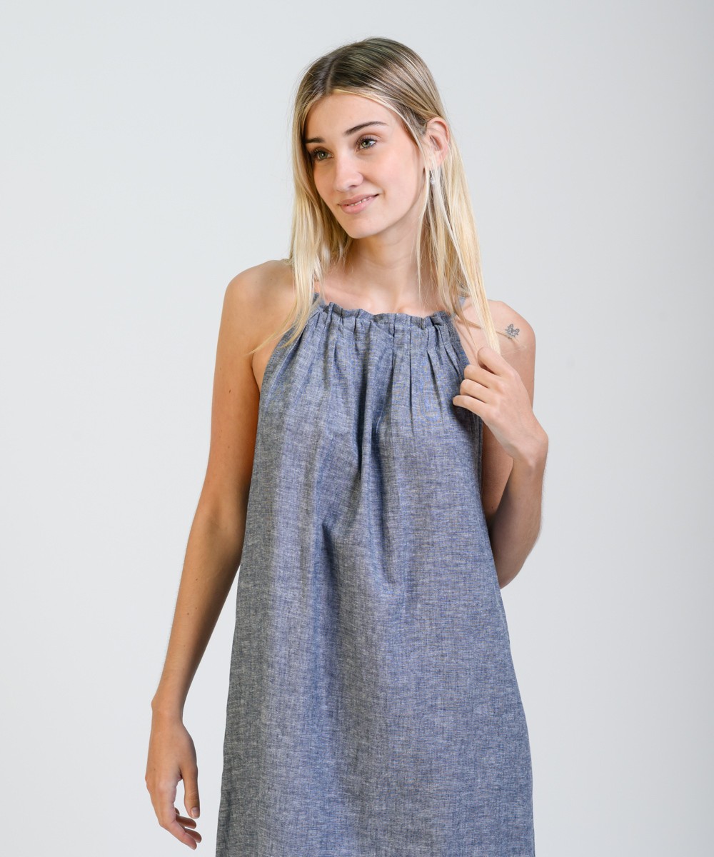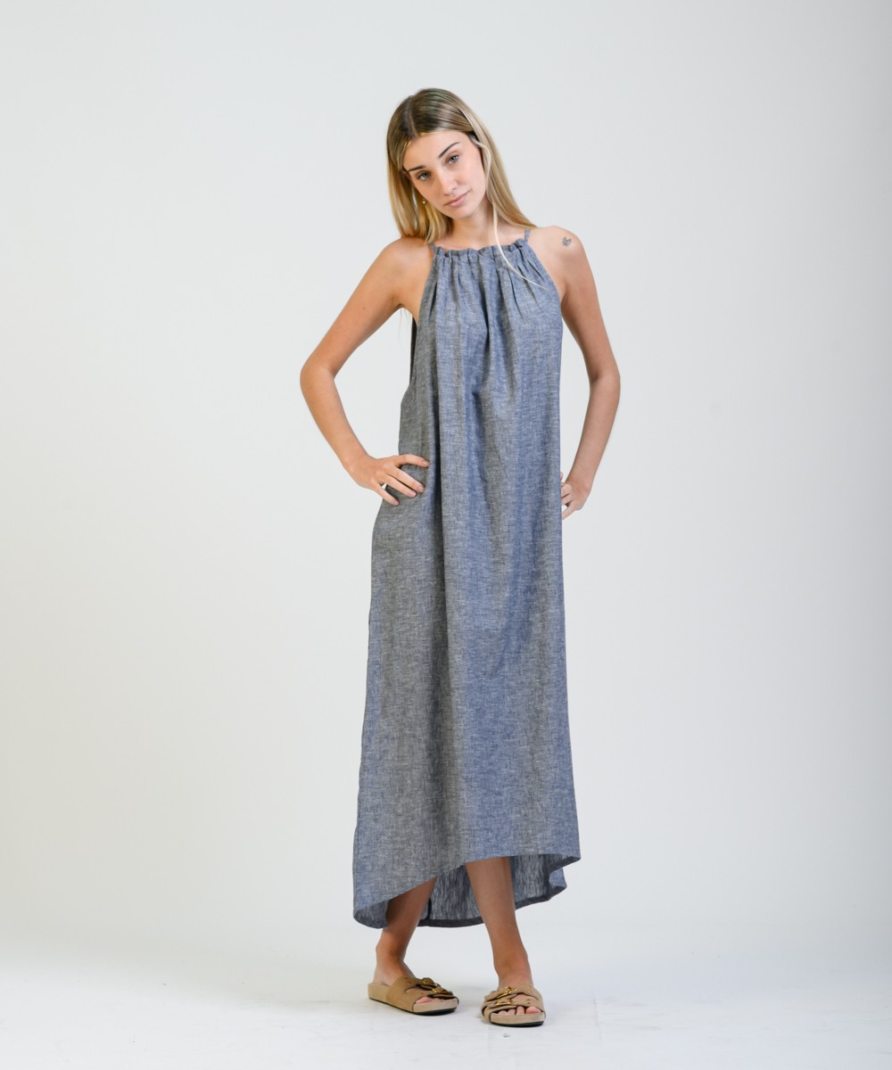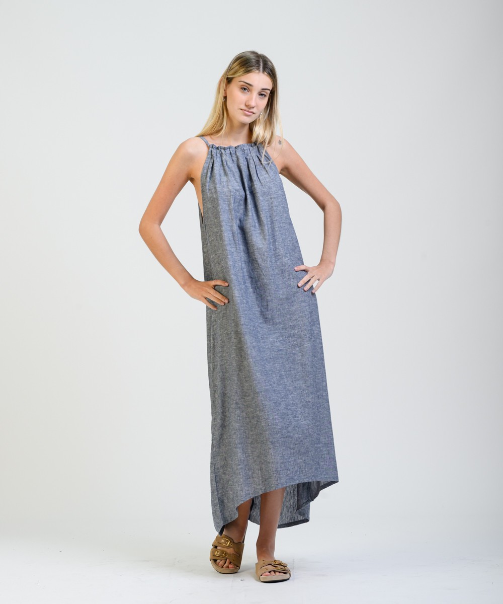 Amplio, liviano y con movimiento natural. Este vestido largo sin mangas está confeccionado en una mezcla suave de lino y algodón, con predominio de textura y frescura. El cuello fruncido se ajusta con un lazo fino en la espalda, creando una abertura sutil que suma detalle sin perder simpleza. El diseño evasé acompaña distintas siluetas con soltura, y el ruedo más largo en la parte trasera aporta fluidez de movimiento al caminar.